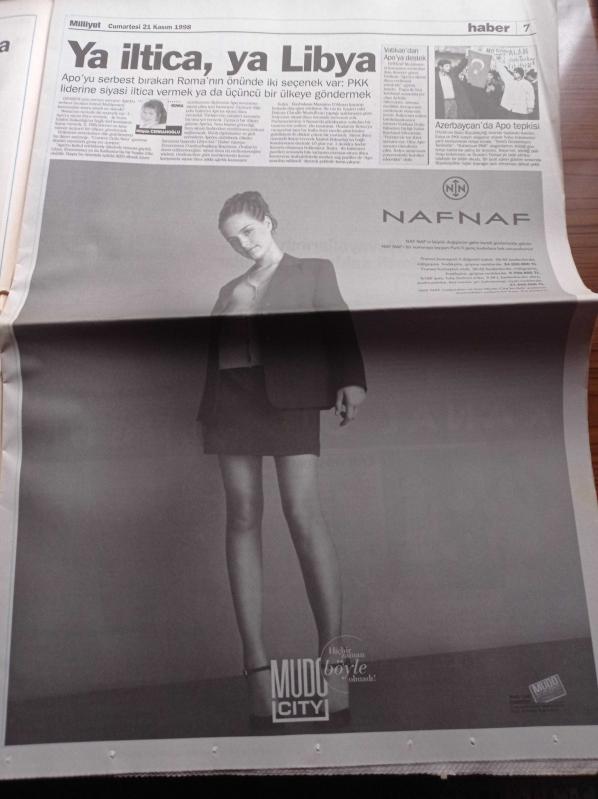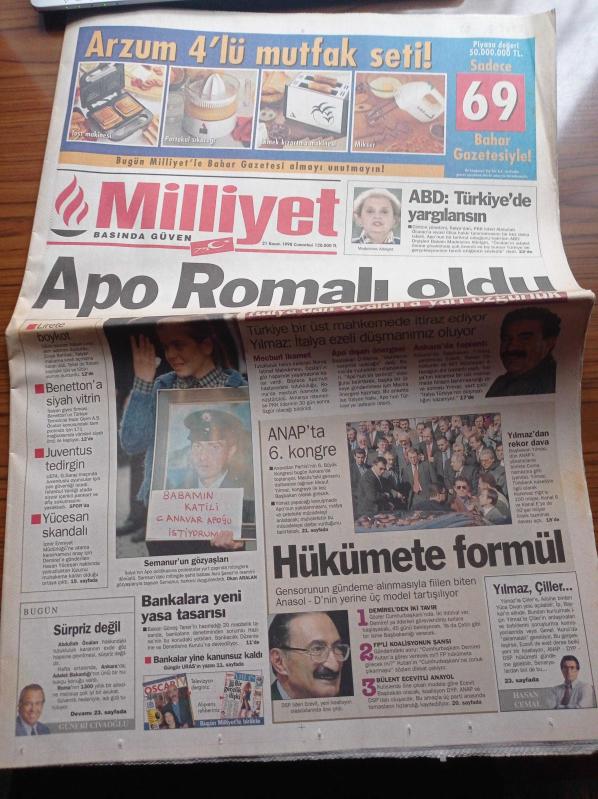 Milliyet Gazetesi - 21 Kasım 1998 - Abdullah Öcalan Romalı Oldu - ABD Abdullah Öcalan Türkiye'de Yargılansın - Benetton'a Siyah Vitrin - ANAP'ta 6. Kongre - Anasol D'nin Yerine Üç Model Tartışılıyor - Başbakan Mesut Yılmaz'dan Rekor Dava - Juventus Galatasaray Maçında Can Güvenliği İstiyor - Hasan Yücesan Skandalı - Ünlü Sunucu Ersin Düzen Manken Sevgilisi Aylin Coşkun Tarafından Bıçaklandı adlı eser Türkçe dilindedir.