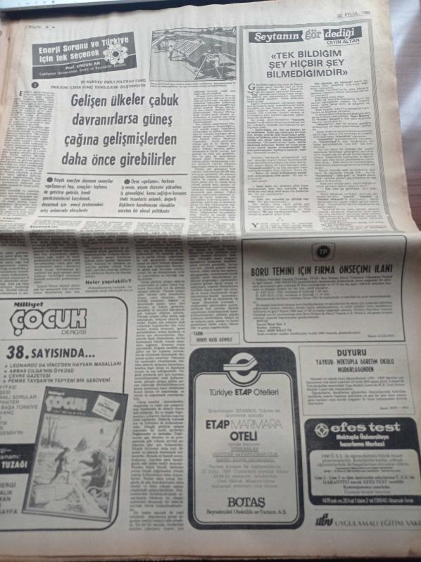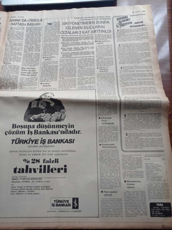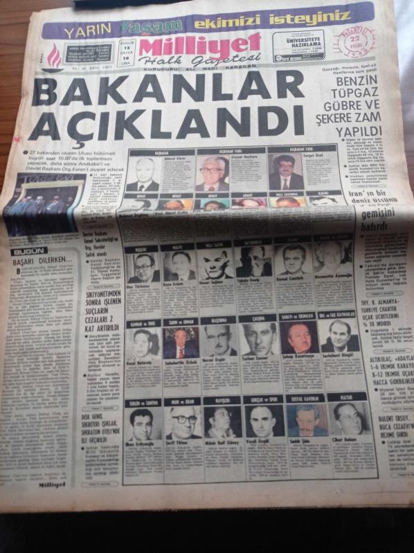 Milliyet Gazetesi - 22 Eylül 1980 - Burhan Felek - Çetin Altan - Bakanlar Açıklandı - Galatasaray'da Bülent Eken'e Geniş Yetkiler Tanındı - Milli Takım İzlanda Maçına Hazırlanıyor - Başbakan Bülend Ulusu - Başbakan Yardımcısı Turgut Özal - Mehmet Özgüneş - İlter Türkmen - Adalet Bakanı Cevdet Menteş - İlhan Öztrak - Milli Savunma Bakanı Haluk Bayülken adlı eser, Kitap > Süreli Yayınlar > Gazeteler kategorisinde İkinci El olarak satıştadır.