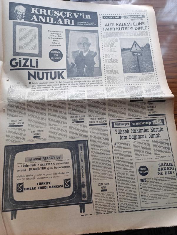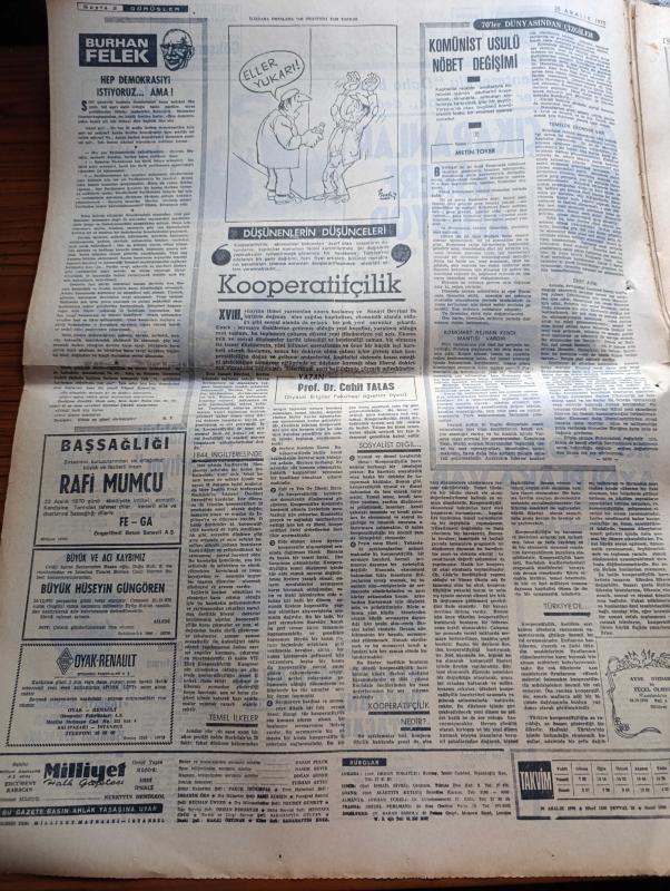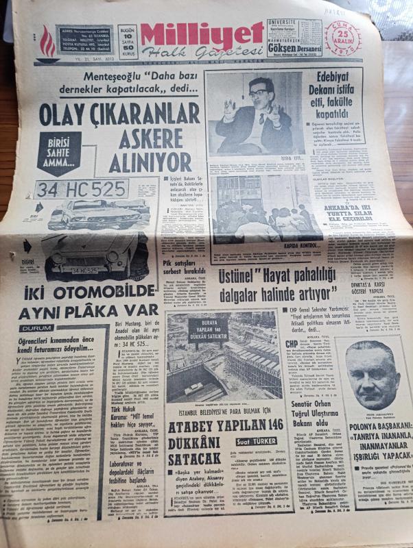 Milliyet Gazetesi - 25 Aralık 1970 - İçişleri Bakanı Menteşeoğlu Daha Bazı Dernekler Kapatılacak Dedi - Biri Mustang Biri De Anadol Olan İki Ayrı Otomobilin Plakaları Aynı 34 HC 525 - Edebiyat Fakültesi Dekanı Profesör Sırrı Erinç İstifa Etti Fakülte Kapatıldı - Rauf Denktaş'a Karşı Gösteri Yapıldı - İstanbul Belediyesine Para Bulmak İçin Aksaray Geçidinde 146 Dükkan Satılabilir - Türk Hukuk Kurumu MİT Temel Hakları Hiçe Sayıyor - Komünist Usulü Nöbet Değişimi Yazan Metin Toker - Ünlü Casus Çiçero Öldü - Evli Bir Kadının Günlüğünden Yazan Peride Celal Yazı Dizisi - Karaoğlan Yazan Ve Çizen Suat Yalaz - Hoş Memo Karikatür Çizen Al Capp - Johnny Hazard Çizen Frank Robbins - Sahne Aşkları Çizen Leonard Starr - Maruf Bey Çizen Martin - Murat Davman'ın Son Macerası İki Kere İki On İki Eder Yazan Ümit Deniz Yazı Dizisi - Kruşçev'in Anıları Yazı Dizisi - Halter Şampiyonasında Balkan İkincisi Olduk - 4 Dünya 2 Balkan 1 Türkiye Rekoru Kırıldı adlı eser, Kitap > Süreli Yayınlar > Gazeteler > Türkiye > Genel > Günlük kategorisinde İkinci El olarak satıştadır.