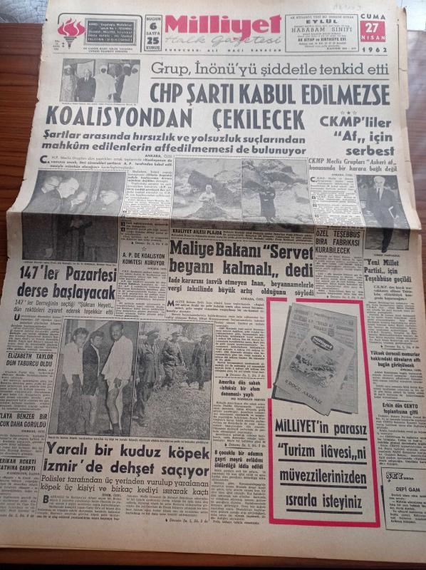 Milliyet Gazetesi - 27 Nisan 1962 - CHP Şartı Kabul Edilmezse Koalisyondan Çekilecek - Cumhuriyetçi Köylü Millet Partililer Af İçin Serbest - 147'ler Pazartesi Derse Başlayacak - Maliye Bakanı Şefik İnan Servet Beyanı Kalmalı Dedi - Elizabeth Taylor Dün Taburcu Oldu - Amerikan Roketi Ay Sathına Çarptı - Gümrük Ve Tekel Bakanı Şevket Bulatoğlu - Özel Teşebbüs Bira Fabrikası Kurulabilecek - Adalet Partisi - Çetin Altan Köşe Yazısı - Suadiye Oteli - Star Marka Masa Radyoları - Walt Disney'in Ayakları - Sami Kohen - Kızıl Kadırga Yazan Abdullah Ziya Kozanoğlu Yazı Dizisi - Docteur Renaud Paris Salatalık Güzellik Sütü - A Milli Takım Peşte'de - Turgay Şeren - Palermo Metin Oktay'a 9 Milyonu Ödeyecek - Brezilya'nın En Formda İki Elemanı Pele Ve Vava - Fiorentinalı Can Bartu Oya Sart İle Evlendi adlı eser, Kitap > Süreli Yayınlar > Gazeteler > Türkiye > Genel > Günlük kategorisinde İkinci El olarak satıştadır.
