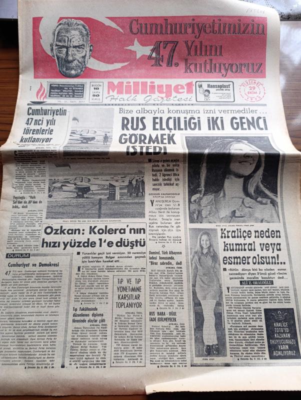Milliyet Gazetesi - 29 Ekim 1970 - Cumhuriyetin 47. Yılı Törenlerle Kutlanıyor - Turhan Feyzioğlu Halk Sol'dan Adalet Partisinden De Bıktı Dedi - Sağlık Bakanı Vedat Ali Özkan Kolera'nın Hızı Yüzde 1'e Düştü - Bize Albayla Konuşma İzni Vermediler Rus Elçiliği İki Genci Görmek İstedi - Kraliçe Neden Kumral Veya Esmer Olsun - TİP ve Kongresi Yazanlar İsmail Cem - Evli Bir Kadının Günlüğünden Yazan Peride Celal Yazı Dizisi - Hoş Memo Karikatür Çizen Al Capp - Johnny Hazard Çizen Frank Robbins - Sahne Aşkları Leonard Starr - Maruf Bey Çizen Martin - Karaoğlan Yazan Ve Çizen Suat Yalaz - Şeytanistan Yazan Ali Yüce Yazı Dizisi - İtiraf Yazan Arthur London Yazı Dizisi - Muhammed Ali Clay Bonevana İle Karşılaşacak - Eskişehirspor Galip - Beşiktaşlı Necmi Ve Kaya'nın Jübilesi Bugün - İşte Beşiktaş'ın Değerli Futbolcusu Kaya Köstepen - Mithatpaşa Stadı, Ali Naci Karacan tarafından kaleme alınmıştır. Milliyet Gazetesi - 29 Ekim 1970 - Cumhuriyetin 47. Yılı Törenlerle Kutlanıyor - Turhan Feyzioğlu Halk Sol'dan Adalet Partisinden De Bıktı Dedi - Sağlık Bakanı Vedat Ali Özkan Kolera'nın Hızı Yüzde 1'e Düştü - Bize Albayla Konuşma İzni Vermediler Rus Elçiliği İki Genci Görmek İstedi - Kraliçe Neden Kumral Veya Esmer Olsun - TİP ve Kongresi Yazanlar İsmail Cem - Evli Bir Kadının Günlüğünden Yazan Peride Celal Yazı Dizisi - Hoş Memo Karikatür Çizen Al Capp - Johnny Hazard Çizen Frank Robbins - Sahne Aşkları Leonard Starr - Maruf Bey Çizen Martin - Karaoğlan Yazan Ve Çizen Suat Yalaz - Şeytanistan Yazan Ali Yüce Yazı Dizisi - İtiraf Yazan Arthur London Yazı Dizisi - Muhammed Ali Clay Bonevana İle Karşılaşacak - Eskişehirspor Galip - Beşiktaşlı Necmi Ve Kaya'nın Jübilesi Bugün - İşte Beşiktaş'ın Değerli Futbolcusu Kaya Köstepen - Mithatpaşa Stadı adlı eser Türkçe dilindedir.