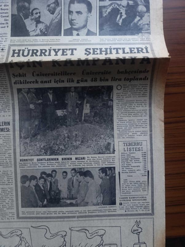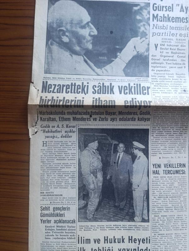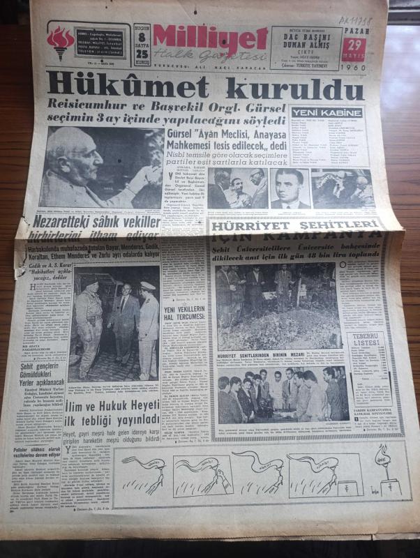 Milliyet Gazetesi - 29 Mayıs 1960 - hükümet kuruldu - Reisicumhur ve Başvekil Orgeneral Cemal Gürsel seçimin 3 ay içinde yapılacağını söyledi - başvekil müdafaa vekili ve silahlı kuvvetler başkumandanı Orgeneral Cemal Gürsel başvekalette Fotoğrafı - Cemal Gürsel ayan Meclisi anayasa mahkemesi tesis edilecek dedi - yeni kabine - devlet vekili Amil Artuz ve Şefik İnan - Maarif vekili profesör Fehmi Yavuz - Alparslan Türkeş fotoğraf - Hürriyet şehitleri için kampanya - Hürriyet şehitlerinden Turan Emeksizin mezarı Fotoğrafı - yeni vekillerin hal tercümesi - İlim ve hukuk heyeti ilk tebliği yayınladı - harp okulunda muhafazada tutulan Celal Bayar Adnan Menderes Namık Gedik Refik Koraltan Ethem Menderes ve Fatin Rüştü Zorlu ayrı odalarda kalıyor - polisler silahsız olarak vazifelerine devam ediyor - Türkiye İş Bankası - bugünkü burç falınız - ibret yazan Çetin Altan - bütün spor hareketi şimdilik durduruldu - America Altay ile oynuyor - bankalar yarın açılıyor - Medeni Berk teslim oldu, Ali Naci Karacan tarafından kaleme alınmıştır. Milliyet Gazetesi - 29 Mayıs 1960 - hükümet kuruldu - Reisicumhur ve Başvekil Orgeneral Cemal Gürsel seçimin 3 ay içinde yapılacağını söyledi - başvekil müdafaa vekili ve silahlı kuvvetler başkumandanı Orgeneral Cemal Gürsel başvekalette Fotoğrafı - Cemal Gürsel ayan Meclisi anayasa mahkemesi tesis edilecek dedi - yeni kabine - devlet vekili Amil Artuz ve Şefik İnan - Maarif vekili profesör Fehmi Yavuz - Alparslan Türkeş fotoğraf - Hürriyet şehitleri için kampanya - Hürriyet şehitlerinden Turan Emeksizin mezarı Fotoğrafı - yeni vekillerin hal tercümesi - İlim ve hukuk heyeti ilk tebliği yayınladı - harp okulunda muhafazada tutulan Celal Bayar Adnan Menderes Namık Gedik Refik Koraltan Ethem Menderes ve Fatin Rüştü Zorlu ayrı odalarda kalıyor - polisler silahsız olarak vazifelerine devam ediyor - Türkiye İş Bankası - bugünkü burç falınız - ibret yazan Çetin Altan - bütün spor hareketi şimdilik durduruldu - America Altay ile oynuyor - bankalar yarın açılıyor - Medeni Berk teslim oldu adlı eser Türkçe dilindedir.