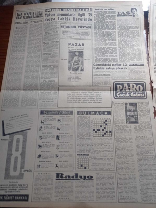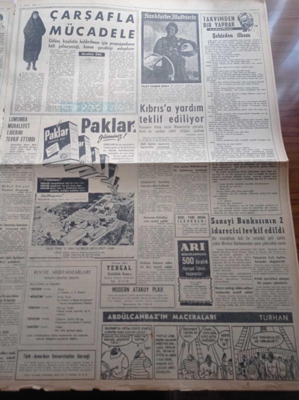 Milliyet Gazetesi - 3 Eylül 1960 - Yargılamaya Dair Plan Hazırlandı - Demokrat Partinin Kapatılması İçin Dava Açılıyor - Rektör Sıddık Sami Onar Komisyonda İhtilaf Yoktur Dedi- Rus Lider Kruşçev Birleşmiş Milletler İçin New York'a Gidiyor - Pilot Teğmen Şenay - Çetin Altan Köşe Yazısı - 21. Venedik Film Festivali - Bugünkü Falınız - Kıbrıs'a Yardım Teklif Ediliyor - CHP Genel Başkanı İsmet İnönü Samatya Hastanesi'nde Muayene Oldu - Yakut Gözlü Kedi Yazan Ümit Deniz Yazı Dizisi - Bülent Tarcan - Pa Ro Çocuk Maması - Walt Disney- Radyolin Magnezi Sütü - Spor Toto Başladı - 1960 Roma Olimpiyat Oyunları - Rusya Dün 3 Altın Madalya Daha Kazandı - Atlet Tamara Press - Atletizmde Altı Olimpiyat Rekoru - Osman Kambur Da Mağlup - Güreşte Şike İddiası adlı eser, Kitap > Süreli Yayınlar > Gazeteler > Türkiye > Genel > Günlük kategorisinde İkinci El olarak satıştadır.