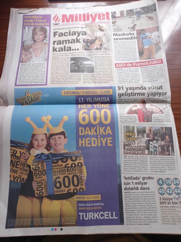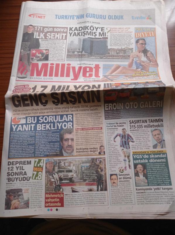 Milliyet Gazetesi - 3 Nisan 2011 - Paris Hilton'un Köpeği 15 Bin Yıl Önce Modaymış - Trabzonspor'da Sevinç Beşiktaş'ta Hüzün - 171 Gün Sonra İlk Şehit - Bu Cam Kule Kadıköy'e Yakışmış Mı - YGS'de Soruların Şifreyle Çözülebildiği İddiası Ortalığı Karıştırdı - ÖSYM Bu Sorular Yanıt Bekliyor - Kemal Kılıçdaroğlu YGS'de Skandal Recep Tayyip Erdoğan'ın Ustalık Dönemi - Eroin Oto Galeri adlı eser Türkçe dilindedir.