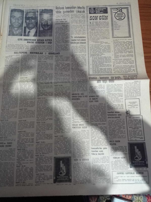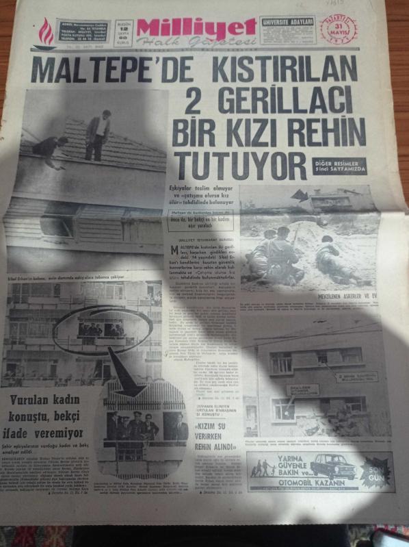 Milliyet Gazetesi - 31 Mayıs 1971 - Maltepe'de Kıstırılan 2 Gerillacı Bir Kızı Rehin Aldı - Mahir Çayan Ve Hüseyin Cevahir Binbaşı Dinçer Erkan'ın Kızı Sibel Erkan'ı Rehin Aldı - Şehir Eşkıyalarının Vurduğu Kadın ve Bekçi Ameliyat Edildi - Binbaşı Dinçer Erkan Eşi Kızım Su Verirken Rehin Alındı - Sıkıyönetim Ve Birinci Ordu Komutanı Faik Türün - Zırhlı Tugay Komutanı General Celal Bulutlar - Yasak Kitapları Sıkıyönetim İlan Edecek - Giresun Ve Adana Birinci Ligde adlı eser, Kitap > Süreli Yayınlar > Gazeteler kategorisinde İkinci El olarak satıştadır.