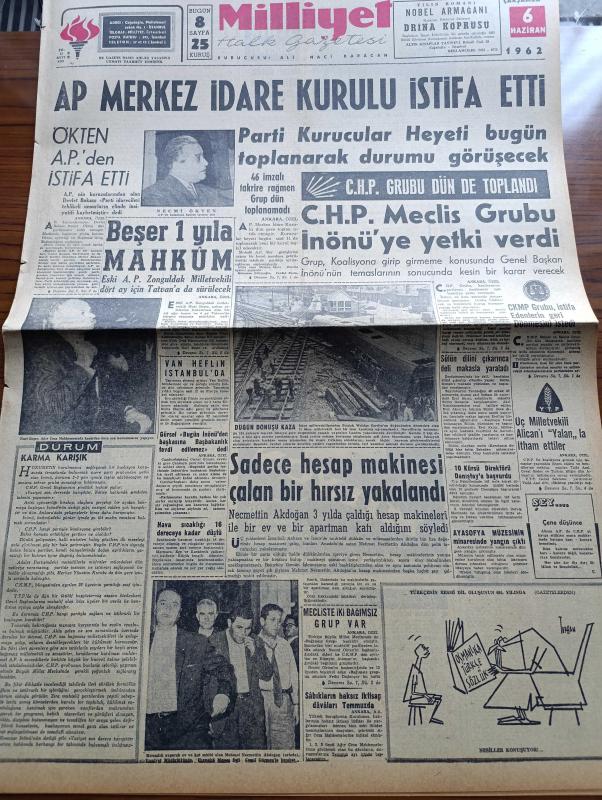 Milliyet Gazetesi - 6 Haziran 1962 - Adalet Partisi İdare Kurulu İstifa Etti - Necmi Ökten Adalet Parti'sinden İstifa Etti - Beşer 1 Yıla Mahkum - CHP Meclis Grubu İsmet İnönü'ye Yetki Verdi - Tanınmış Sinema Yıldızı Van Heflin İstanbul'da - Sadece Hesap Makinesi Çalan Bir Hırsız Yakalandı - Cemal Gürsel Bugün İsmet İnönü'den Başkasına Başbakanlık Tevdi Edilemez Dedi - Ayasofya Müzesinin Minaresinde Yangın Çıktı - Çetin Altan Köşe Yazısı - Araba Vapuru Kuyruğu Dün Yıldız'a Kadar Uzadı - Gelin Taşı Yazan Yaman Koray Yazı Dizisi - Kızıl Kadırga Yazan Abdullah Ziya Kozanoğlu Yazı Dizisi - Cici Can Çizen Bedri - Tombik Çizen Trog - 27 Mayıs'ın Gerisindeki 5 Yılın Hikâyesi Hazırlayanlar Ömer Sami Coşar Abdi İpekçi - Fellini'nin Yaptığı Bir Filmle İtalyan Sosyetesinin İpliği Pazara Çıktı - Grundig Radyo - Lambretta Motorsikletlerin Büyük Rally Kafilesi Geldi - Fenerbahçe İle İddialı Maç Yapacağız - Karagümrük Tarık Kutver'i 50 Bin Liraya Galatasaray'a Verecek - Galatasaray Beşiktaş, Ali Naci Karacan tarafından kaleme alınmıştır. Milliyet Gazetesi - 6 Haziran 1962 - Adalet Partisi İdare Kurulu İstifa Etti - Necmi Ökten Adalet Parti'sinden İstifa Etti - Beşer 1 Yıla Mahkum - CHP Meclis Grubu İsmet İnönü'ye Yetki Verdi - Tanınmış Sinema Yıldızı Van Heflin İstanbul'da - Sadece Hesap Makinesi Çalan Bir Hırsız Yakalandı - Cemal Gürsel Bugün İsmet İnönü'den Başkasına Başbakanlık Tevdi Edilemez Dedi - Ayasofya Müzesinin Minaresinde Yangın Çıktı - Çetin Altan Köşe Yazısı - Araba Vapuru Kuyruğu Dün Yıldız'a Kadar Uzadı - Gelin Taşı Yazan Yaman Koray Yazı Dizisi - Kızıl Kadırga Yazan Abdullah Ziya Kozanoğlu Yazı Dizisi - Cici Can Çizen Bedri - Tombik Çizen Trog - 27 Mayıs'ın Gerisindeki 5 Yılın Hikâyesi Hazırlayanlar Ömer Sami Coşar Abdi İpekçi - Fellini'nin Yaptığı Bir Filmle İtalyan Sosyetesinin İpliği Pazara Çıktı - Grundig Radyo - Lambretta Motorsikletlerin Büyük Rally Kafilesi Geldi - Fenerbahçe İle İddialı Maç Yapacağız - Karagümrük Tarık Kutver'i 50 Bin Liraya Galatasaray'a Verecek - Galatasaray Beşiktaş adlı eser Türkçe dilindedir.