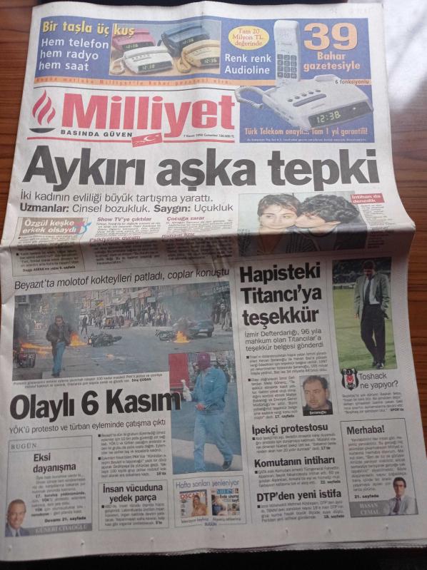 Milliyet Gazetesi - 7 Kasım 1998 - Recep Tayyip Erdoğan - Alaattin Çakıcı Beni Öldürecekler - Abdi İpekçi Protestosu - Mesut Yılmaz - Tümgeneral Fahrettin Alparslan'ın İntiharı -Süleyman Seba - Sergen Yalçın - Elvir Boliç - Ebru Şallı İle Gözde Tan'a Uyuşturucu Suçundan Hapis Cezası İsteniyor - Engin Koç Podyuma Veda Etti - Serdar Ortaç Cezaevinden Faks Gönderdi - Demet Şener - Buz Kraliçesi Katarina Witt - Olaylı YÖK Protestosu - Hapisteki Titancı Kenan Şeranoğlu'na Teşekkür adlı eser Türkçe dilindedir.
