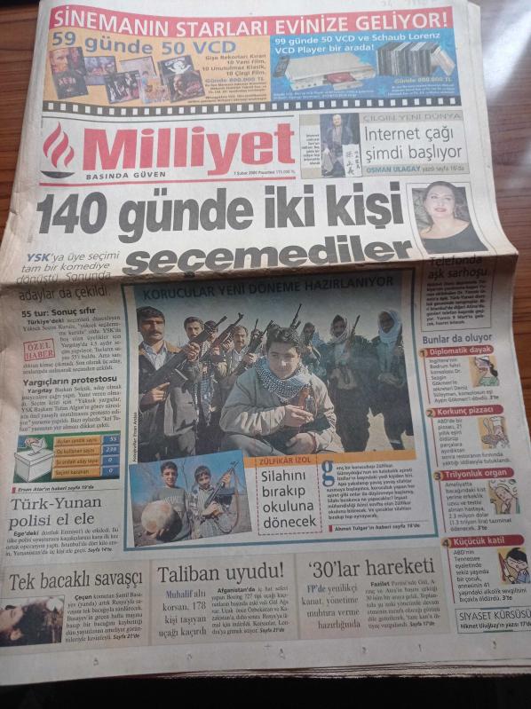Milliyet Gazetesi - 7 Şubat 2000 - Yüksek Seçim Kurulu'na Üye Seçimi Tam Bir Komediye Dönüştü - 140 Günde İki Kişi Seçemediler - Korucular Yeni Döneme Hazırlanıyor - Zülfikar İzol Silahını Bırakıp Okuluna Dönecek - Nükhet Duru Depremde Türkiye'nin Yardımına Koşan Yunan Ekibinden Doktor Yannis Gionis'e Aşık - Çeçen Komutan Şamil Basayev Artık Rusya'yla Tek Bacağıyla Savaşacak - Taliban Uyudu adlı eser Türkçe dilindedir.