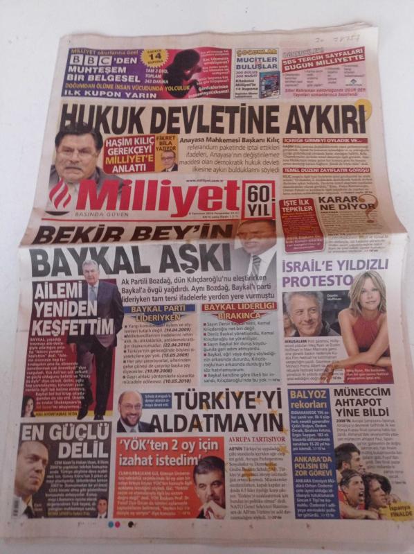 Milliyet Gazetesi - 8 Temmuz 2010 - Yelkenli Sporları - Dünya Kupası - İsrail'e Yıldızlı Protesto - Dustin Hoffman - Meg Ryan - Balyoz Davası Rekorları - Anayasa Mahkemesi Başkanı Haşim Kılıç Hukuk Devletine Aykırı - Bekir Bozdağ'ın Deniz Baykal Aşkı - Abdullah Gül adlı eser Türkçe dilindedir.