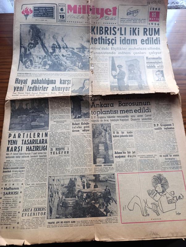 Milliyet Gazetesi - Turkish Newspaper - 11 Mayıs 1956 - Atina'da nümayiş fotoğraf - Kıbrıslı 2 rum tethişçi idam edildi - Atina'daki elçilikler muhafaza altında - Yeni Ticaret vekili Zeyyat Mandalinci konuşuyor fotoğraf - hayat pahalılığına karşı yeni tedbirler alınıyor - Ankara barosunun toplantısı men edildi - Robert koleji'nde talebe grevi devam ediyor - İstanbul Ankara Radyosu Programı - Kızılyıldız ve Stalin yazan Peyami Safa - İstanbul'da basın toplantısı yapan Martine Carol hayranlarının hücumundan konuşamadı Fotoğrafı - sanatkarlar bir tiyatro kanunu hazırlanmasını istiyor - İsmail Dümbüllü kongrede Fotoğrafı - ölüm perdesi yazan Ümit Deniz yazı dizisi - Boncuk Walt Disney - hep yarın yazan Cahit Uçuk Yazı Dizisi - Zeki Müren bebek gazinosunda - Ali Muhiddin Hacı Bekir - Macaristan Demir perdeyi kaldırıyor - Galatasaray İsrail'e gidemiyor - İstanbulspor 4 Kasımpaşa 4 Fotoğrafı - basketbolda Modasporlular şampiyonadan çekildiler - Fenerbahçe haftayı boş geçirecek - Beşiktaş kamp