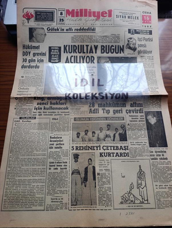 Milliyet Gazetesi - Turkish Newspaper - 16 Ekim 1964 - Kasım Gülek'in affı reddedildi - hükümet Devlet Demir Yolları grevini 30 gün için durdurdu - Zenci Lider Martin Luther King Nobel armağanını zenci hakları için kullanacak Fotoğrafı - CHP kurultayı bugün açılıyor - 28 mahkumun affını adli tıp geri çevirdi - Cizre'de kaçırılan 5 kişi başlarına geleni anlattı Fotoğrafı - bankaların ikramiyeleri yeni şartlara tabi tutuldu - Milli Eğitim teftiş heyeti başkanı Ekrem Üçyiğit Atatürk devrini diktatörlük olarak vasıflandırdı - İngilterede seçimlerde İşçi Partisi şanslı görülüyor - 150 milyonluk bir blok yazan Ahmet Emin Yalman - minimini beyler yazan Çetin Altan - Fruko 1 milyon liralık hediye dağıtıyor - Poker Play tıraş bıçakları - Avrupa kupa galipleri turnuvasının ikinci turunda Galatasaray'ın rakibi Legia - Tokyo 1964 olimpiyatları - Güreş Federasyon reisi Suat Bolayır aldığımız neticeler talihsizlik dedi - Austria Kalecisi Özcan Arkoç'u bekleyen büyük imtihan - Kara yıldırım Hayes adlı eser, Kitap > Süreli Yayınlar > Gazeteler > Türkiye > Genel > Günlük kategorisinde İkinci El olarak satıştadır.