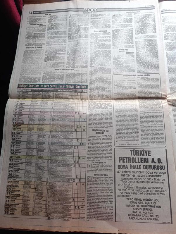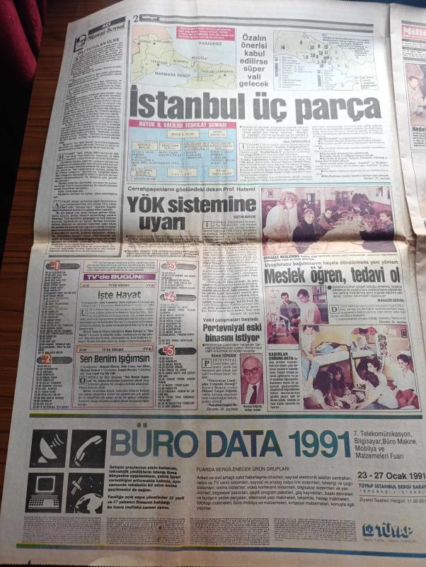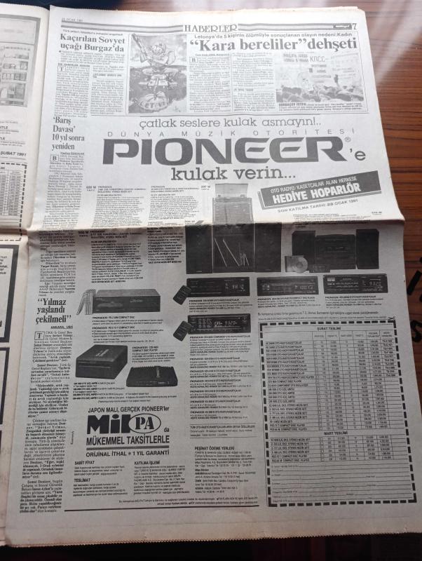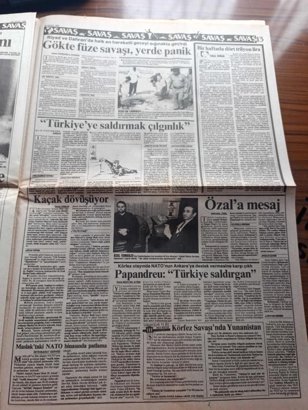 Milliyet Gazetesi - Turkish Newspaper - 22 Ocak 1991 - esas usul ve üslup yazan Altan Öymen Başmakale - muhtemel bir Irak saldırısına karşı doğu ve Güneydoğu'da askeri harekat yoğunlaştı - ABD'nin hesapları tutmadı Cheney yerde savaş aylar sürebilir dedi fotoğraf - Kara savaşı korkusu - özel trenlerle Erzurum'dan yola çıkarılan tank ve zırhlı araçlar Batman'a vardı fotoğraf - Magic Box'a dava kuyruğu - Turgut Özal intihara kalkışıyor - Sovyet uçağı kaçırıldı - ABD'nin federe Irak planı - kimyasal silah kullanılmasından korkan Süryaniler İstanbul'a göçtü - Tel Aviv'e saldırı ispanyolları korkuttu - Turgut Özal'ın önerisi kabul edilirse İstanbul 3 parça olacak - televizyonda bugün - Kara bereliler dehşeti - Barış davası 10 yıl sonra yeniden - Kenan Evren inisiyatif Saddamda - SHP ve HEP'ten Savaş heyeti - Süleyman Demirel Saddam Hüseyin Frankenstein dedi - Saddam Mezopotamya Arap Devleti başkanı olmak istiyordu - maslak'taki NATO binasında patlama - Marlboro - Kosecki'ye göre sistem, Aydın Doğan tarafından kaleme alınmıştır. Milliyet Gazetesi - Turkish Newspaper - 22 Ocak 1991 - esas usul ve üslup yazan Altan Öymen Başmakale - muhtemel bir Irak saldırısına karşı doğu ve Güneydoğu'da askeri harekat yoğunlaştı - ABD'nin hesapları tutmadı Cheney yerde savaş aylar sürebilir dedi fotoğraf - Kara savaşı korkusu - özel trenlerle Erzurum'dan yola çıkarılan tank ve zırhlı araçlar Batman'a vardı fotoğraf - Magic Box'a dava kuyruğu - Turgut Özal intihara kalkışıyor - Sovyet uçağı kaçırıldı - ABD'nin federe Irak planı - kimyasal silah kullanılmasından korkan Süryaniler İstanbul'a göçtü - Tel Aviv'e saldırı ispanyolları korkuttu - Turgut Özal'ın önerisi kabul edilirse İstanbul 3 parça olacak - televizyonda bugün - Kara bereliler dehşeti - Barış davası 10 yıl sonra yeniden - Kenan Evren inisiyatif Saddamda - SHP ve HEP'ten Savaş heyeti - Süleyman Demirel Saddam Hüseyin Frankenstein dedi - Saddam Mezopotamya Arap Devleti başkanı olmak istiyordu - maslak'taki NATO binasında patlama - Marlboro - Kosecki'ye göre sistem adlı eser Türkçe dilindedir.