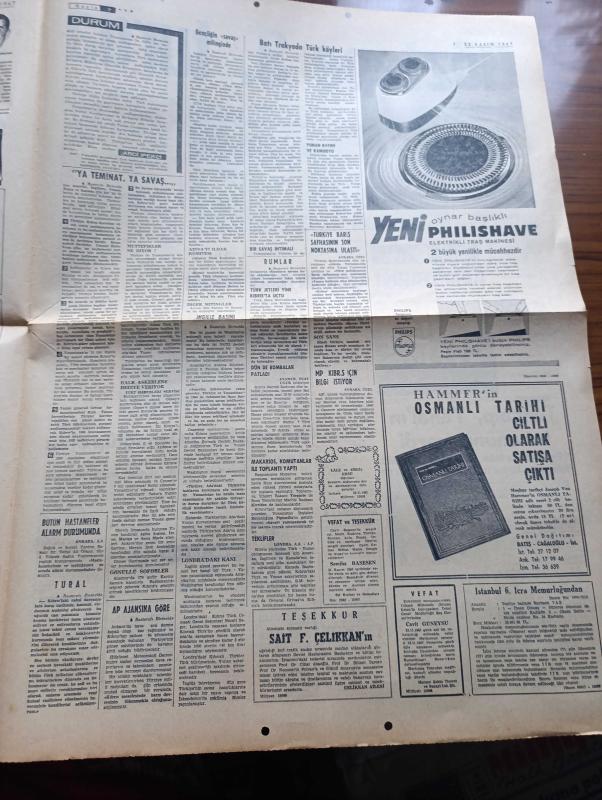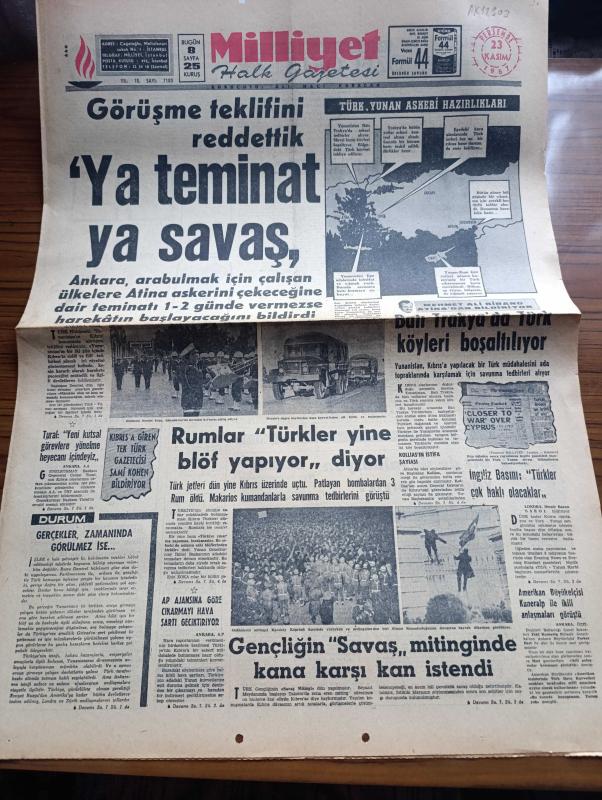 Milliyet Gazetesi - Turkish Newspaper - 23 Kasım 1967 - gerçekler zamanında görülmez ise yazan Abdi İpekçi Başmakale - Türk Yunan askeri hazırlıkları - Yunanistan'ın görüşme teklifini reddettik ya teminat ya savaş - Atina askeri çekeceğine dair teminatı 1 2 günde vermezse harekatın başlayacağı bildirildi - Rumlar Türkler yine blöf yapıyor diyor - Oramiral Necdet Uran İskenderun'da merasim kıtasını teftiş ediyor fotoğraf - Mersin'e doğru kaydırılan kara kuvvetlerine ait birlik ve malzemeler fotoğraf - Kıbrıs'a giren tek Türk gazetecisi Sami Kohen bildiriyor - genelkurmay Başkanı Orgeneral Cemal Tural yeni kutsal görevlere yönelme heyecanı içindeyiz dedi - İngiliz basını Türkler çok haklı olacaklar dedi - Mehmet Ali Birand Atina'dan bildiriyor - gençliğin Savaş mitinginde kana karşı kan istedi - 10 binlerce mitingi Karaköy köprüsü üzerinde yürürken fotoğraf - mitingçilerden biri Alman konsolosluğunun duvarına bayrak dikerken görülüyor fotoğraf - Göztepe 3. Turda - Atletico Madrid adlı eser, Kitap > Süreli Yayınlar > Gazeteler > Türkiye > Genel > Günlük kategorisinde İkinci El olarak satıştadır.