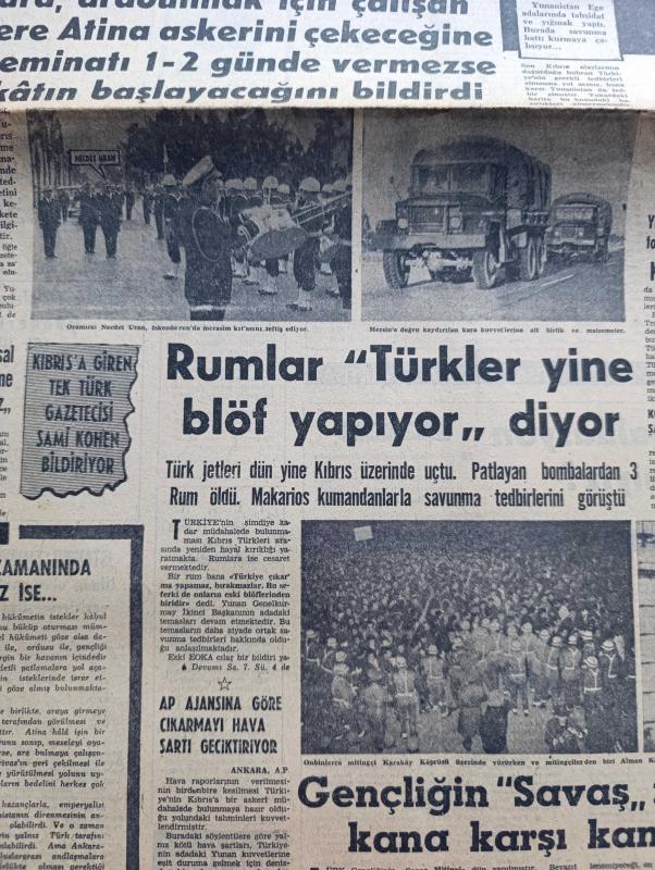 Milliyet Gazetesi - Turkish Newspaper - 23 Kasım 1967 - gerçekler zamanında görülmez ise yazan Abdi İpekçi Başmakale - Türk Yunan askeri hazırlıkları - Yunanistan'ın görüşme teklifini reddettik ya teminat ya savaş - Atina askeri çekeceğine dair teminatı 1 2 günde vermezse harekatın başlayacağı bildirildi - Rumlar Türkler yine blöf yapıyor diyor - Oramiral Necdet Uran İskenderun'da merasim kıtasını teftiş ediyor fotoğraf - Mersin'e doğru kaydırılan kara kuvvetlerine ait birlik ve malzemeler fotoğraf - Kıbrıs'a giren tek Türk gazetecisi Sami Kohen bildiriyor - genelkurmay Başkanı Orgeneral Cemal Tural yeni kutsal görevlere yönelme heyecanı içindeyiz dedi - İngiliz basını Türkler çok haklı olacaklar dedi - Mehmet Ali Birand Atina'dan bildiriyor - gençliğin Savaş mitinginde kana karşı kan istedi - 10 binlerce mitingi Karaköy köprüsü üzerinde yürürken fotoğraf - mitingçilerden biri Alman konsolosluğunun duvarına bayrak dikerken görülüyor fotoğraf - Göztepe 3. Turda - Atletico Madrid, Ali Naci Karacan tarafından kaleme alınmıştır. Milliyet Gazetesi - Turkish Newspaper - 23 Kasım 1967 - gerçekler zamanında görülmez ise yazan Abdi İpekçi Başmakale - Türk Yunan askeri hazırlıkları - Yunanistan'ın görüşme teklifini reddettik ya teminat ya savaş - Atina askeri çekeceğine dair teminatı 1 2 günde vermezse harekatın başlayacağı bildirildi - Rumlar Türkler yine blöf yapıyor diyor - Oramiral Necdet Uran İskenderun'da merasim kıtasını teftiş ediyor fotoğraf - Mersin'e doğru kaydırılan kara kuvvetlerine ait birlik ve malzemeler fotoğraf - Kıbrıs'a giren tek Türk gazetecisi Sami Kohen bildiriyor - genelkurmay Başkanı Orgeneral Cemal Tural yeni kutsal görevlere yönelme heyecanı içindeyiz dedi - İngiliz basını Türkler çok haklı olacaklar dedi - Mehmet Ali Birand Atina'dan bildiriyor - gençliğin Savaş mitinginde kana karşı kan istedi - 10 binlerce mitingi Karaköy köprüsü üzerinde yürürken fotoğraf - mitingçilerden biri Alman konsolosluğunun duvarına bayrak dikerken görülüyor fotoğraf - Göztepe 3. Turda - Atletico Madrid adlı eser Türkçe dilindedir.