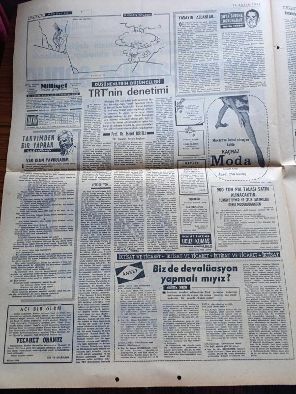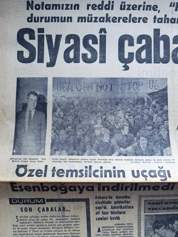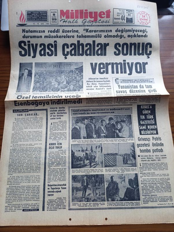 Milliyet Gazetesi - Turkish Newspaper - 24 Kasım 1967 - son çabalar yazan Abdi İpekçi Başmakale - siyasi çabalar sonuç vermiyor - Yunanistan'da tam Savaş düzenine girdi - Mehmet Ali Birand Atina'dan bildiriyor - Kıbrıs'a giren tek Türk gazetecisi Sami Kohen Lefkoşa'dan bildiriyor - Sami Kohen'in Geçitkale ve Boğazköy'den yolladığı en son fotoğraflar - Cyrus Vance'ı Ankara'ya getiren uçağın Esenboğa havalimanı'na inmesini önlemek amacıyla piste oturan gençler fotoğraf - gençler Amerika bizi durduramaz dövizi taşıyor fotoğraf - Amerikan cumhurbaşkanı Johnson'un özel temsilcisi Cyrus Vance'ın uçağı esenboğa'ya indirilmedi - Ankara'da amerikalılara ait bazı binaların camları kırıldı - Bulgaristan Arnavutluk ve Yugoslavya Yunan sınırında yığınak yapıyor - Grivasçı Patris gazetesi önünde bomba patladı - TRT'nin denetimi yazan Profesör Doktor İsmet Giritli - Göztepe antrenörü Adnan Süvari her şey Türk futbolu için fotoğraf - fuar şehirleri kupası'nda yarı finali oynayabiliriz adlı eser, Kitap > Süreli Yayınlar > Gazeteler > Türkiye > Genel > Günlük kategorisinde İkinci El olarak satıştadır.