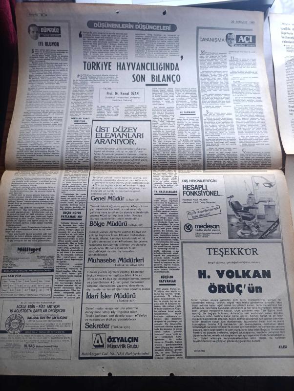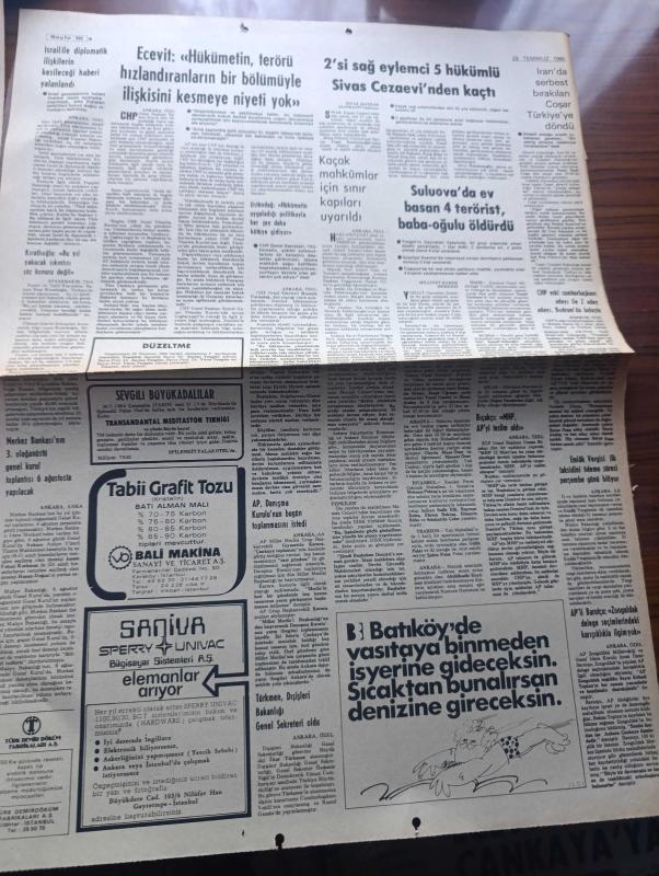 Milliyet Gazetesi - Turkish Newspaper - 29 Temmuz 1980 - Süleyman Demirel karikatürü çizen Bedri Koraman - 2'si sağ eylemci 5 hükümlü Sivas cezaevinden kaçtı - Suluova'da 4 terörist baba oğulu öldürdü - Bülent Ecevit hükümetin terörü hızlandıran bir bölümü ile ilişki kesmeye niyeti yok - Muhsin Batur - Turan Güneş - İran'da tutuklanan gazeteci Hami Sami Coşar serbest bırakıldı - AP Bitlis milletvekili Abidin İnan Gaydalı Bitlis Hizan yolu bu sezon bitmezse Adalet Partisinden istifa ederim dedi - İzmir belediye başkanı İhsan Alyanak taburcu oldu - İstanbul belediyesi sovyetlerden mal karşılığı 25 Loder 7 jeneratör aldı fotoğraf - bedelli askerlik yapacaklar 2 ay eğitim için Burdur'a gidecek - iyi oluyor yazan Refik Erduran - dayanışma yazan Mümtaz Soysal - enerji ve tabii kaynaklar bakanı Esat Kıratlıoğlu Bu yıl yakacak sıkıntısı söz konusu değil - SDP Genel Başkanı Cenan Bıçakçı MHP Adalet Partisini teslim aldı dedi - hisse senedi tahvil ve bankerler - SEKA ucuz ambalaj kağıdı sağlıyor, Ali Naci Karacan tarafından kaleme alınmıştır. Milliyet Gazetesi - Turkish Newspaper - 29 Temmuz 1980 - Süleyman Demirel karikatürü çizen Bedri Koraman - 2'si sağ eylemci 5 hükümlü Sivas cezaevinden kaçtı - Suluova'da 4 terörist baba oğulu öldürdü - Bülent Ecevit hükümetin terörü hızlandıran bir bölümü ile ilişki kesmeye niyeti yok - Muhsin Batur - Turan Güneş - İran'da tutuklanan gazeteci Hami Sami Coşar serbest bırakıldı - AP Bitlis milletvekili Abidin İnan Gaydalı Bitlis Hizan yolu bu sezon bitmezse Adalet Partisinden istifa ederim dedi - İzmir belediye başkanı İhsan Alyanak taburcu oldu - İstanbul belediyesi sovyetlerden mal karşılığı 25 Loder 7 jeneratör aldı fotoğraf - bedelli askerlik yapacaklar 2 ay eğitim için Burdur'a gidecek - iyi oluyor yazan Refik Erduran - dayanışma yazan Mümtaz Soysal - enerji ve tabii kaynaklar bakanı Esat Kıratlıoğlu Bu yıl yakacak sıkıntısı söz konusu değil - SDP Genel Başkanı Cenan Bıçakçı MHP Adalet Partisini teslim aldı dedi - hisse senedi tahvil ve bankerler - SEKA ucuz ambalaj kağıdı sağlıyor adlı eser Türkçe dilindedir.