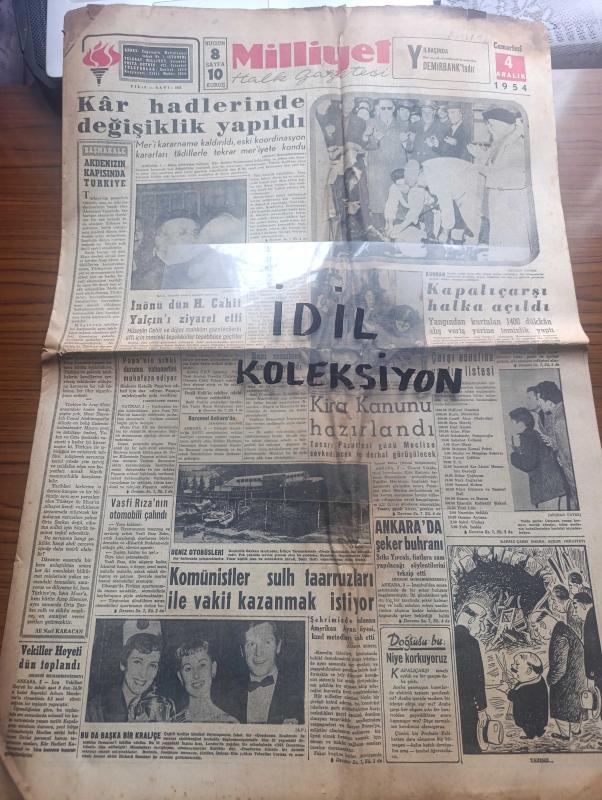 Milliyet Gazetesi - Turkish Newspaper - 4 Aralık 1954 - Akdeniz'in kapısında Türkiye yazan Ali Naci Karacan Başmakale - kar hadlerinde değişiklik yapıldı - İsmet İnönü dün Hüseyin Cahit Yalçın'ı ziyaret etti Fotoğrafı - Kapalıçarşı halka açıldı - yangından kurtarılan 1400 dükkan alışveriş yerine temizlik yaptı - Çarşı esnafının yardım listesi - komünistler sulh taarruzları ile vakit kazanmak istiyor - sevilen artist Vasfi Rıza Zobu'nun otomobili çalındı - Dağlar kralı yazan Refi Cevad Ulunay Yazı Dizisi - Pervane Yazan Kerime Nadir Yazı Dizisi - Atatürk'ün bir kadına mektupları tercüme ve izah eden Peyami Safa Yazı Dizisi - Cingöz Recai yazan Server Bedi Yazı Dizisi - Türkiye İş Bankası - Galatasaray Emniyetle Lig'in en enteresan maçını bugün oynuyor - Stanley Matthews hala gözde futbolcu - Galatasaray Beogradski basketbol maçı - Vefa Garbis İsmet Tarık ve Recai'ye boykot verdi - milli takım grekoromen seçmeleri bugün başlıyor - Beykoz Kasımpaşa karşılaşıyor - Bülent Akkurt, Ali Naci Karacan tarafından kaleme alınmıştır. Milliyet Gazetesi - Turkish Newspaper - 4 Aralık 1954 - Akdeniz'in kapısında Türkiye yazan Ali Naci Karacan Başmakale - kar hadlerinde değişiklik yapıldı - İsmet İnönü dün Hüseyin Cahit Yalçın'ı ziyaret etti Fotoğrafı - Kapalıçarşı halka açıldı - yangından kurtarılan 1400 dükkan alışveriş yerine temizlik yaptı - Çarşı esnafının yardım listesi - komünistler sulh taarruzları ile vakit kazanmak istiyor - sevilen artist Vasfi Rıza Zobu'nun otomobili çalındı - Dağlar kralı yazan Refi Cevad Ulunay Yazı Dizisi - Pervane Yazan Kerime Nadir Yazı Dizisi - Atatürk'ün bir kadına mektupları tercüme ve izah eden Peyami Safa Yazı Dizisi - Cingöz Recai yazan Server Bedi Yazı Dizisi - Türkiye İş Bankası - Galatasaray Emniyetle Lig'in en enteresan maçını bugün oynuyor - Stanley Matthews hala gözde futbolcu - Galatasaray Beogradski basketbol maçı - Vefa Garbis İsmet Tarık ve Recai'ye boykot verdi - milli takım grekoromen seçmeleri bugün başlıyor - Beykoz Kasımpaşa karşılaşıyor - Bülent Akkurt adlı eser Türkçe dilindedir.