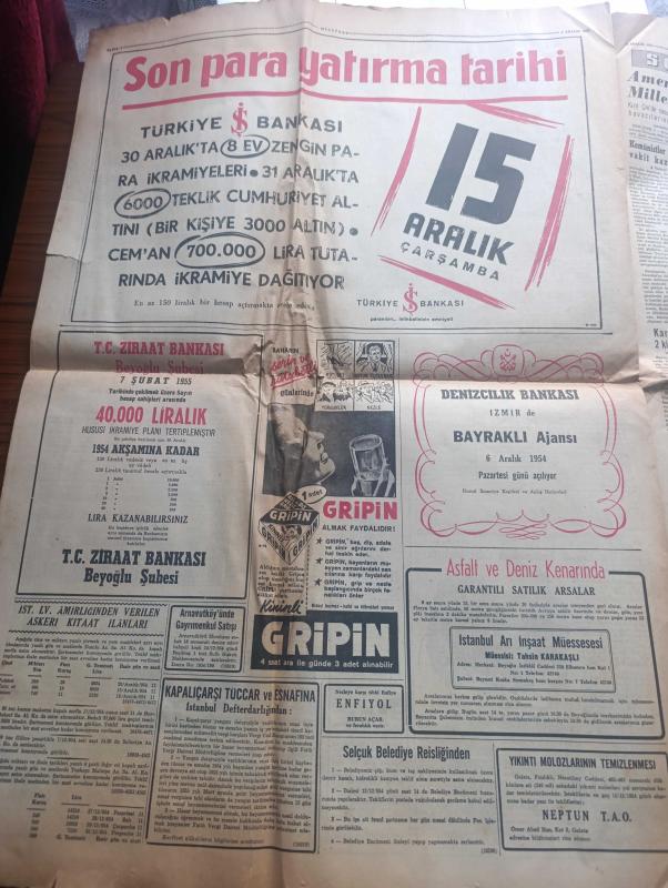 Milliyet Gazetesi - Turkish Newspaper - 4 Aralık 1954 - Akdeniz'in kapısında Türkiye yazan Ali Naci Karacan Başmakale - kar hadlerinde değişiklik yapıldı - İsmet İnönü dün Hüseyin Cahit Yalçın'ı ziyaret etti Fotoğrafı - Kapalıçarşı halka açıldı - yangından kurtarılan 1400 dükkan alışveriş yerine temizlik yaptı - Çarşı esnafının yardım listesi - komünistler sulh taarruzları ile vakit kazanmak istiyor - sevilen artist Vasfi Rıza Zobu'nun otomobili çalındı - Dağlar kralı yazan Refi Cevad Ulunay Yazı Dizisi - Pervane Yazan Kerime Nadir Yazı Dizisi - Atatürk'ün bir kadına mektupları tercüme ve izah eden Peyami Safa Yazı Dizisi - Cingöz Recai yazan Server Bedi Yazı Dizisi - Türkiye İş Bankası - Galatasaray Emniyetle Lig'in en enteresan maçını bugün oynuyor - Stanley Matthews hala gözde futbolcu - Galatasaray Beogradski basketbol maçı - Vefa Garbis İsmet Tarık ve Recai'ye boykot verdi - milli takım grekoromen seçmeleri bugün başlıyor - Beykoz Kasımpaşa karşılaşıyor - Bülent Akkurt adlı eser, Kitap > Süreli Yayınlar > Gazeteler > Türkiye > Genel > Günlük kategorisinde İkinci El olarak satıştadır.