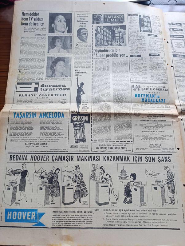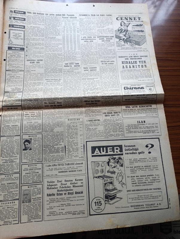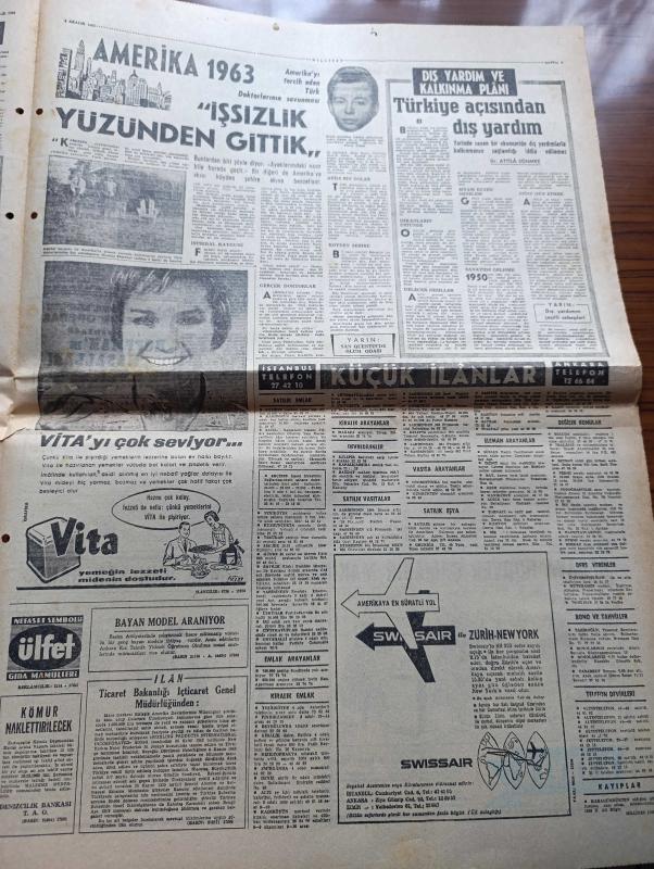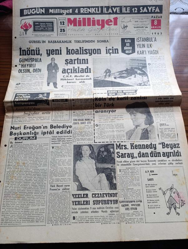 Milliyet Gazetesi - Turkish Newspaper - 8 Aralık 1963 - Cemal Gürsel'in başbakanlık teklifinden sonra İsmet İnönü yeni koalisyon için şartını açıkladı - Ragıp Gümüşpala hayırlı olsun dedi - CHP Meclisi de hükümet kurmamak kararı aldı - İstanbul'a yılın ilk karı yağdı - Almanya özel muhabirimiz Örsan Öymen bildiriyor Köln'de katil zanlısı bir Türk aranıyor - CHP'den ihraç edilen Avni Doğan İsmet İnönü'yü isbata davet etti - Nuri Eroğan'ın Belediye başkanlığı iptal edildi - Mrs. Kennedy beyaz saray'dan Dün ayrıldı - Çerden çöpten yazan Çetin Altan - siyah laleler yazan Ragıp Şevki Yeşim Yazı Dizisi - İstanbul Ankara Radyosu Programı - hem Doktor hem TV yıldızı hem de kraliçe Rosella Risi Fotoğrafı - Kirk Douglas ve Jean Simmons spartaküs'ün bir sahnesinde Fotoğrafı - Galatasaray Demirspor'u 1 0 mağlup edebildi Fotoğrafı - Fenerbahçe Linfield ile maç yapmak üzere Belfasta gidiyor - Beykoz'da yenilen Göztepe artık namağlup değil Fotoğraf - milliyet Spor kervanı Darüşşafaka'da Fotoğrafı adlı eser, Kitap > Süreli Yayınlar > Gazeteler > Türkiye > Genel > Günlük kategorisinde İkinci El olarak satıştadır.