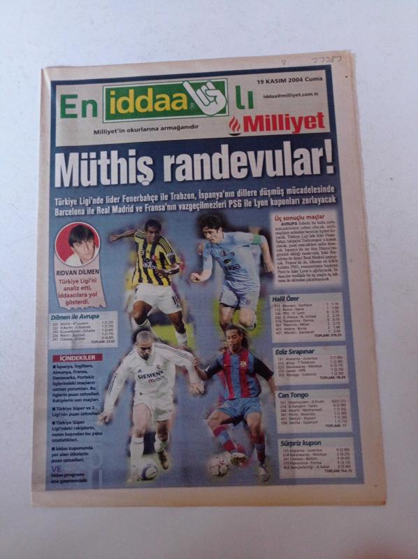 Milliyet İddaa Gazetesi - 19 Kasım 2004 - Marcio Nobre - Fatih Tekke - Ronaldo - Ronaldinho - Monaco - Atalanta - Juventus - Galatasaray - İspanya Ligi adlı eser Türkçe dilindedir.