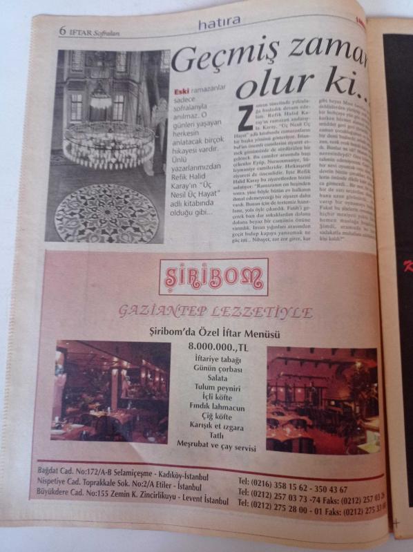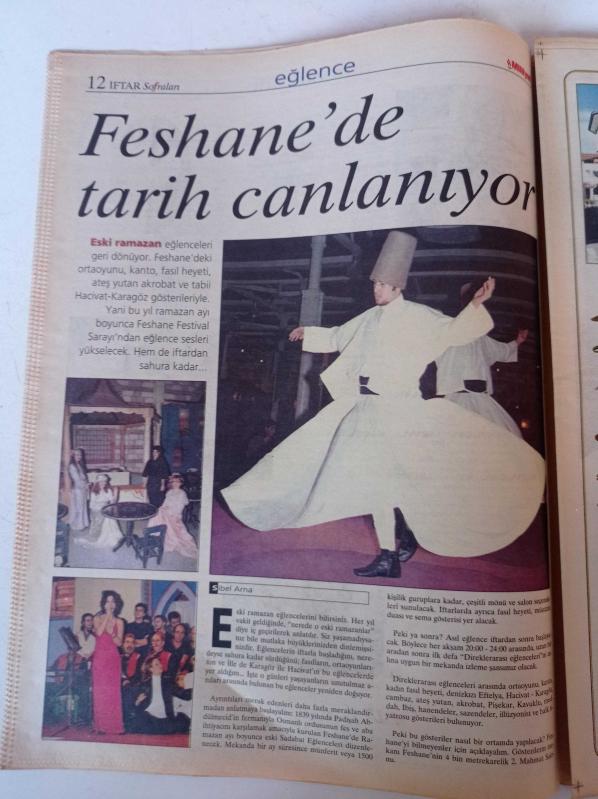 Milliyet İftar Sofraları Gazetesi -9 Aralık 1999 - Feshane'de Tarih Canlanıyor - Koza Restaurant - Restoran Atmosferinde İftar - Kallavi Restaurant - Bekçi Babadan Maniler - Hacivat Karagöz adlı eser Türkçe dilindedir.