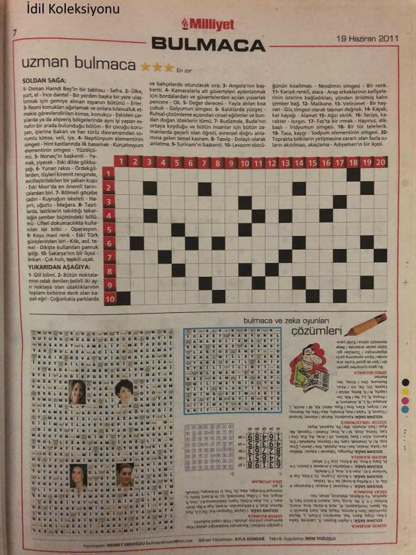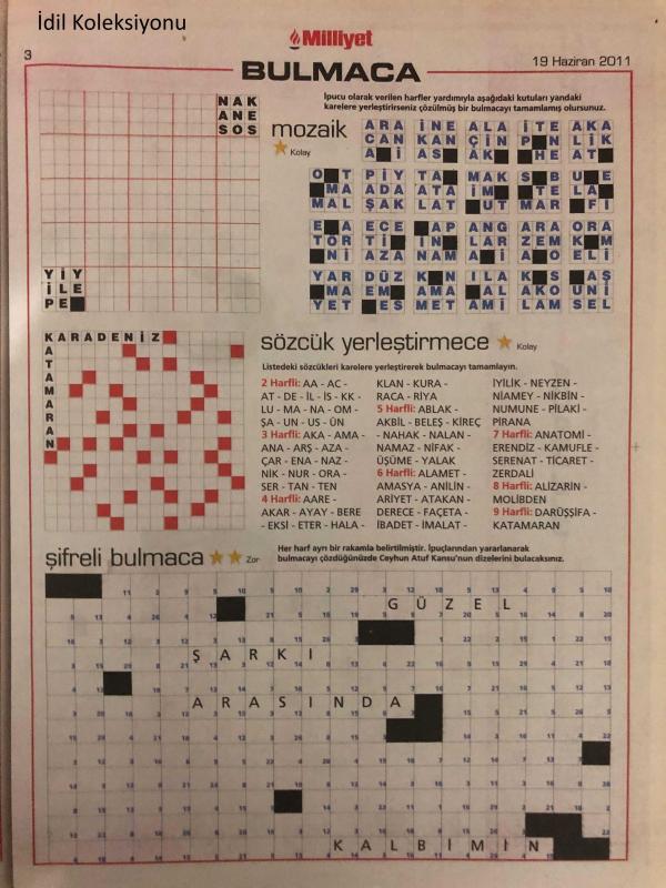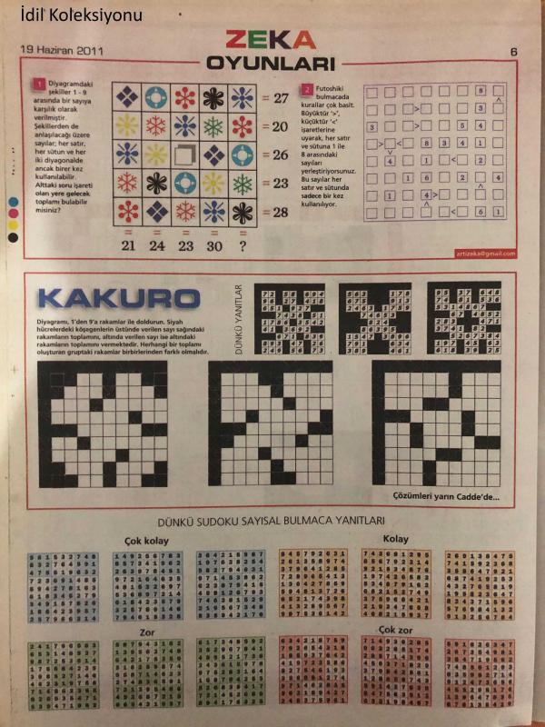 Milliyet Pazar Bulmaca Gazetesi, 19 Haziran 2011, Zeka Oyunları, Kakuro, Sudoku, Güncel Bulmaca, Kolay bulmaca, Uzman Bulmaca, Sözcük Yerleştirmece, Zeka Oyunları, Çapraz Bağlar, Mozaik, Futoshıkı adlı eser Türkçe dilindedir.