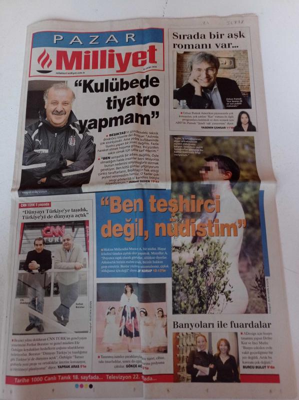 Milliyet Pazar Gazetesi - 10 Ekim 2004 - Bedri Baykam - Karikatürist Yiğit Özgür -Ben Teşhirci Değil Nüdistim Makine Mühendisi Muzaffer A. - Beşiktaş Antrenörü Vicente Del Bosque- Orhan Pamuk adlı eser, Kitap > Süreli Yayınlar > Gazeteler kategorisinde İkinci El olarak satıştadır.