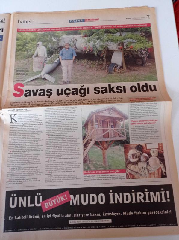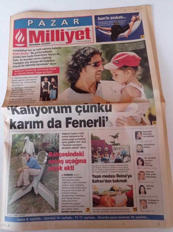 Milliyet Pazar Gazetesi - 14 Temmuz 2002 - Rüştü Reçber Fotoğrafı - Haberci Coşkun Aral Bahçesindeki Savaş Uçağına Çiçek Ekti - Yazın Modası Reina'ya Safran 'dan Bakmak adlı eser Türkçe dilindedir.