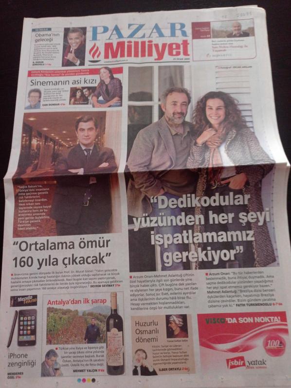 Milliyet Pazar Gazetesi - 25 Ocak 2009 - Arzum Onan ve Mehmet Aslantuğ Fotoğrafı - Ortalama Ömür 160 Yıla Çıkacak - Anevrizma Genini Dünyada İlk Bulan Profesör Doktor Murat Günel - Sinemanın Asi Kızı Tomris Giritlioğlu adlı eser Türkçe dilindedir.