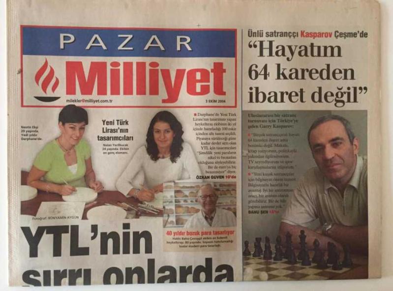 Milliyet Pazar Gazetesi 3 Ekim 2004 - Yeni Türk Lirasının Tasarımcıları YTLnin Sırrı Onlarda , Ünlü Santranççı Kasparov Çeşmede GZ20605, en son 20 gün önce güncellenmiştir.