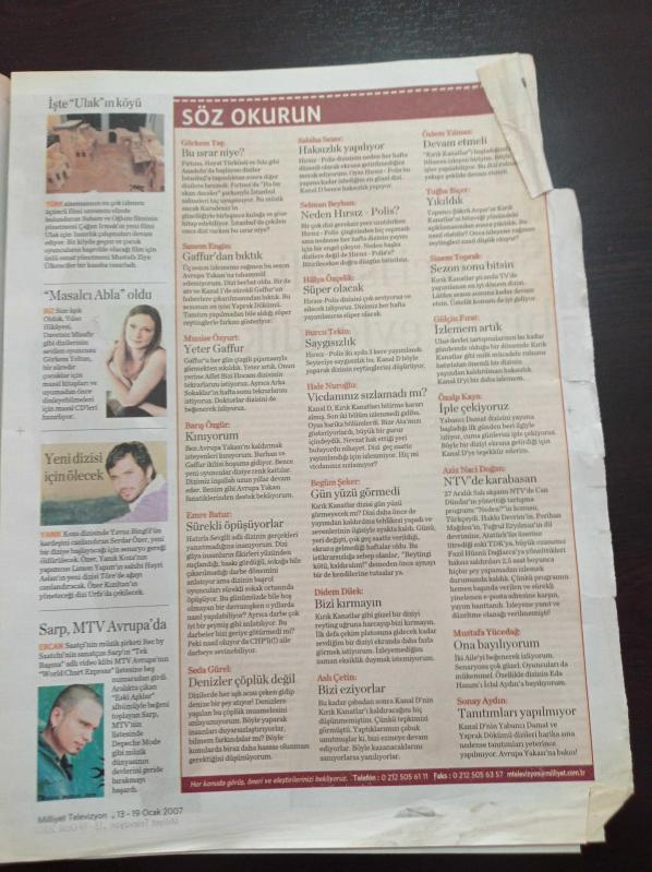 Milliyet Televizyon Gazetesi - 13 19 Ocak 2007 - Murat Yıldırım ve Burçin Terzioğlu Fotoğrafı - İşte En Güzel Çocuk Kanalı - Haftanın Dizisi Selena - Atatürk Emret Komutanım'da - Sinem Kobal - Pınar Altuğ Neden Behzat Uygur'u İstemedi - Oktay Kaynarca adlı eser Türkçe dilindedir.
