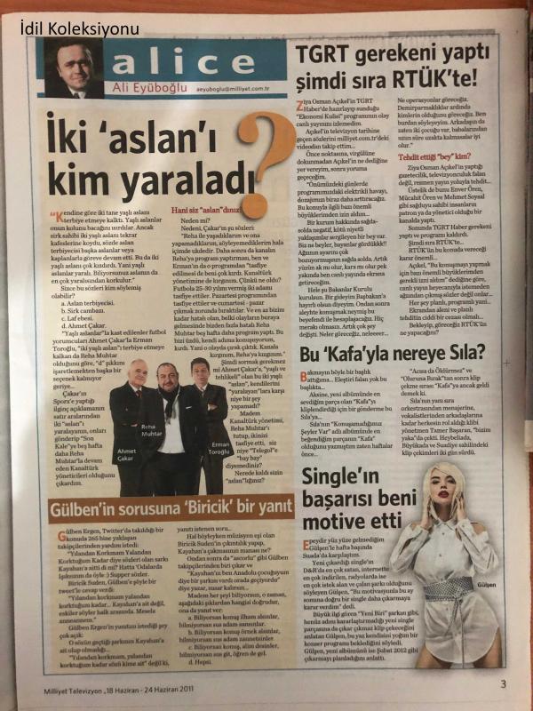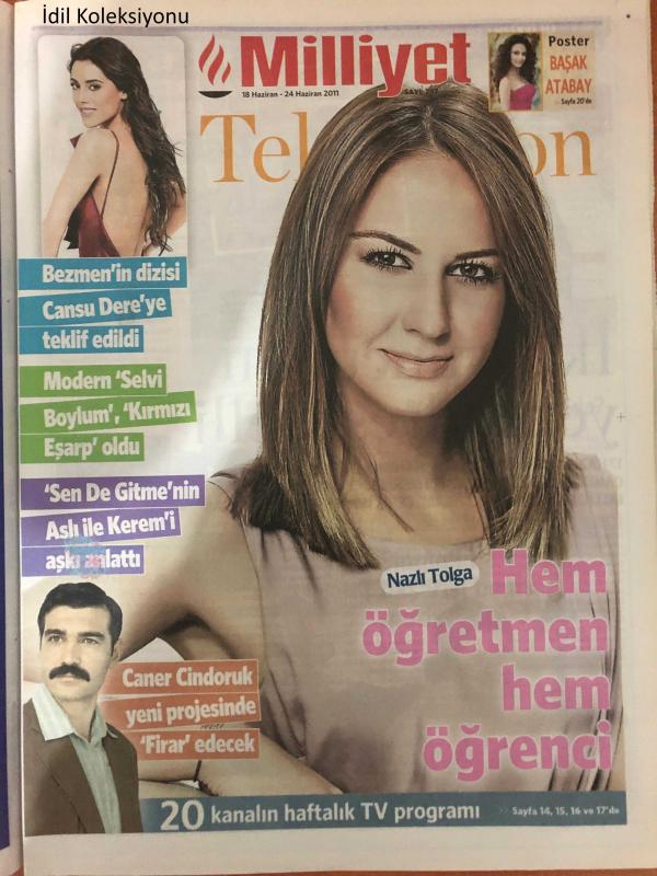 Milliyet Televizyon Gazetesi , 18 Haziran - 24 Haziran 2011 , Cansu Dere, Başak Atabay, Caner Cindoruk, Nazlı Tolga, Bezmen'in Dizisi ve Cansu Dere, "Selvi Boylum, Kırmızı Eşarp" Dizisi, "Sen De Gitme" Dizisi ve Aslı ile Kerem, Caner Cindoruk'un Yeni Projesi "Firar", Nazlı Tolga'nın Çift Görevi adlı eser Türkçe dilindedir.