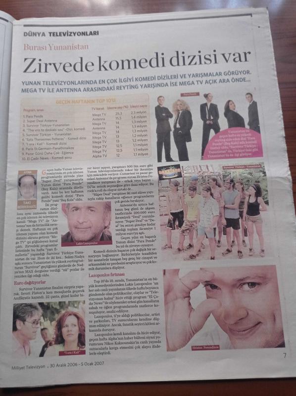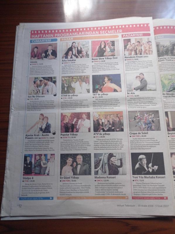 Milliyet Televizyon Gazetesi - 3 Aralık 2006 5 Ocak 2007 - Mehmet Ali Alabora Fotoğrafı - Haftanın Dizisi Karınca Yuvası - Erdal Beşikçioğlu Recep Yazıcıoğlu İle Ruh İkizi Gibiyiz - En Son Babalar Duyar Dizisi De Bitti - Maçolar Özlem Tekin'i Yüksek Ökçeli Yaptı - Pokemon - Başak Köklükaya'nın Korkusu - Meltem Şarkışlalı - Elhamra'yı Tuğba Özay İşletecek - Hande Yener adlı eser Türkçe dilindedir.