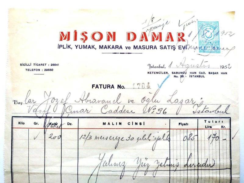 Mişon DAMAR / İplik, yumak, makara, ve masura satış evi - Fatura başlıklı ürün, Efemera, Müzik, Sinema > Belge ve Evraklar > Türkçe Belgeler kategorisi altında İkinci El olarak satılmaktadır.