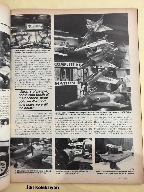 Model Airplane - July 1982 - Vintage Magazine - İngilizce Uzaktan Kumandalı Model Uçak Dergisi - F86 Sabre Jet - Aurora 1600 ARF - Trystar 15 ARF - QB20H - Spirit of 76 - P38 Lightning - CG Gentle Lady - Top Flite Metrick - F4U Corsair - P47 Thunderbolt - P39 Aircobra - Tiger Moth - The Hotshot 45