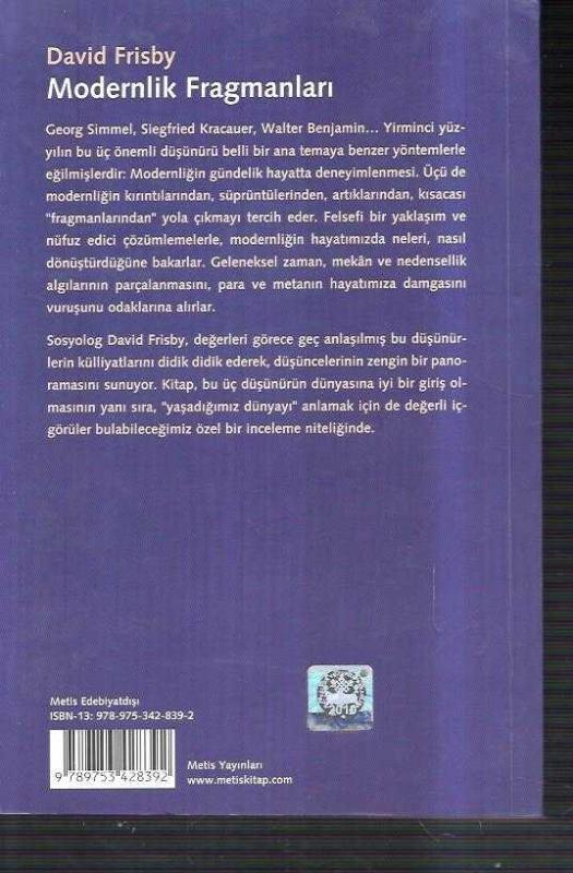 Modernlik Fragmanları simmel, kracauer ve benjamin'in eserlerinde modernlik teorileri, David Frisby tarafından kaleme alınmıştır. Kitap 2012 yılında yayınlanmıştır. Bu baskının çevirisi Akın Terzi tarafından yapılmıştır. 355 sayfadır. Sayfa bilgisi 2. hamur olarak belirtilmiştir. Modernlik Fragmanları simmel, kracauer ve benjamin'in eserlerinde modernlik teorileri adlı eser Türkçe dilindedir.