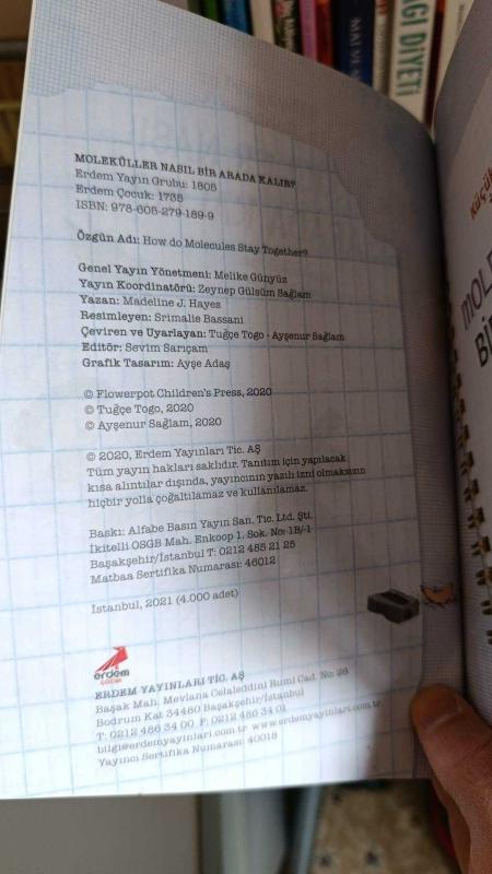 Moleküller Nasıl Bir Arada Kalır?, Madeline J. Hayes tarafından kaleme alınmıştır. Kitap 2021 yılında ERDEM ÇOCUK YAYINLARI tarafından [İstanbul] 9786052791899 ISBN kodu ile yayınlanmıştır. Bu baskının çevirisi Tuğçe Toğo tarafından yapılmıştır. Moleküller Nasıl Bir Arada Kalır? adlı eser Türkçe dilindedir.