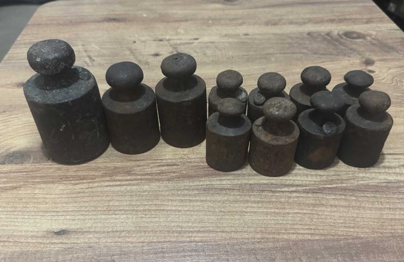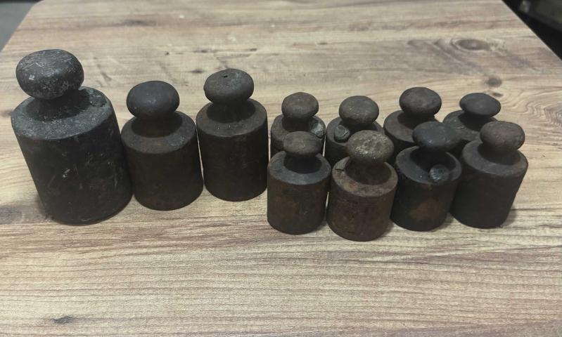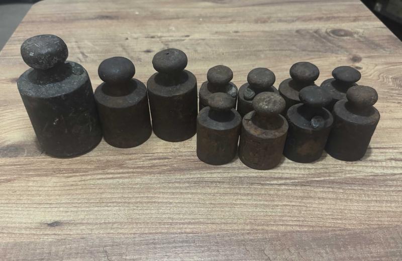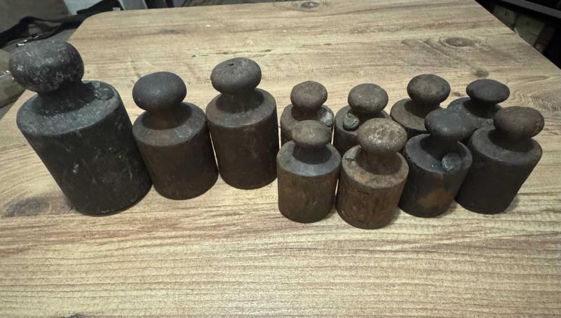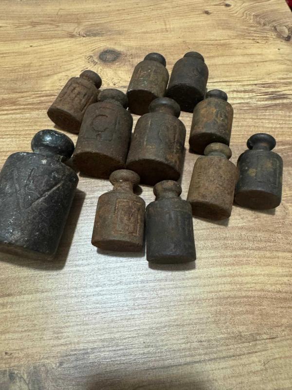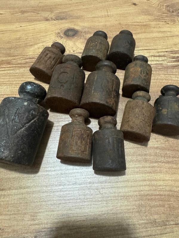 Mühürlü & Damgalı Antika Terazi Ağırlık Seti 1 adet 2 kiloluk 2 adet 1 kiloluk 8 adet 500 gramlık Toplam 11 adet Koleksiyonluk ve dekoratif değeri yüksek, mühür detayları korunmuş tam set! Her parça üzerinde belirgin harf damgaları ve çerçeveli dönem mühürleri mevcuttur.