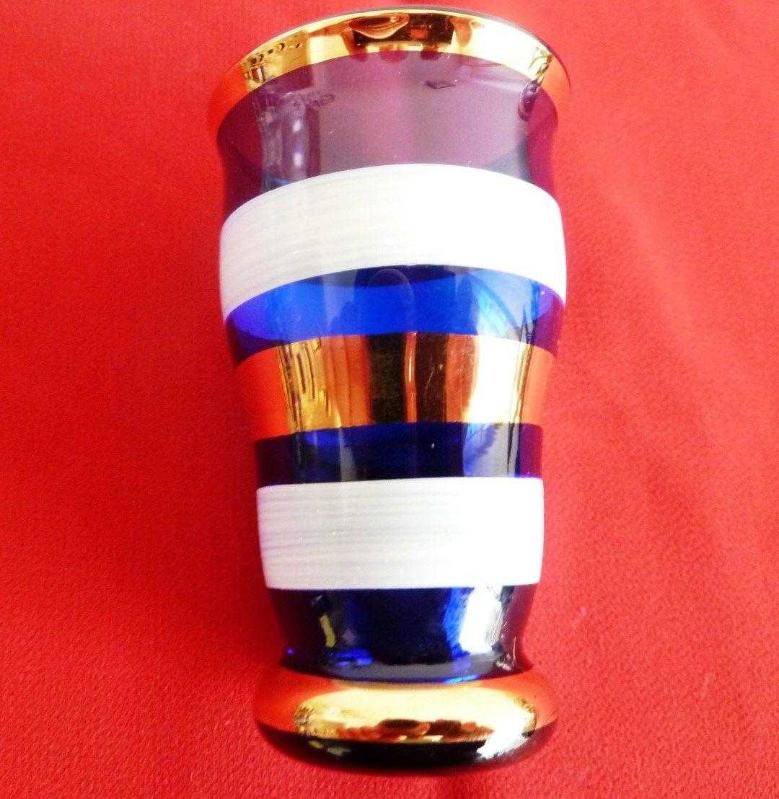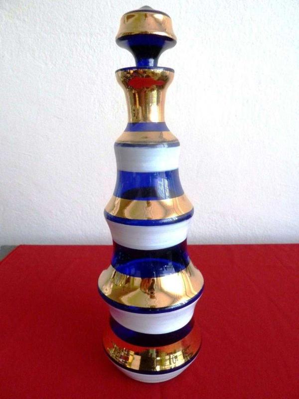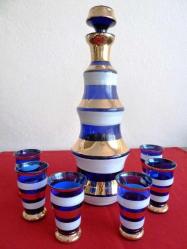 Marka: Murano Ürün grubu: Antika Bohem cam ve kristal objeler- Murano likör takımı. Şişe + 5 kadeh. Avrupa menşei. Tüm yüzeyler mavi cam üzeri beyaz ve altın yaldızla kalın çizgilerle bezenmiş. Likör şişesi üç boğumlu ve şekil itibarı ile az bulunan bir model. Kondisyonu iyi. 2 kadeh ağzında ufak bir çizik ve atık dışında herhangi bir kırığı yoktur. Resimde 6 ad. kadeh gözükmektedir. 1 adedi kırıldığından 5 ad. olarak teslim edilecektir. Şişe Y: 23 cm taban çapı 6.5 cm. Kadeh Y: 6.5cm. Taban çapı:4 cm.