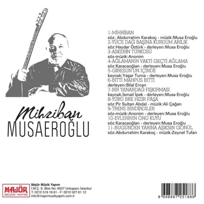 Musa Eroğlu Mihriban CD SIFIR JELATİNLİ AMBALAJINDADIR Yurtiçi kargo ile gönderilecektir. Mihriban Söz: Abdurrahim Karakoç / Müzik: Musa Eroğlu Yüce Dağ Başına Başına Kurdum Arılık Söz: Haydar Öztürk / Derleyen: Musa Eroğlu Askerin Türküsü Söz ve Müzik: Anonim Ağlamanın Vakti Geçti Ağlama Söz: Karacaoğlan / Derleyen: Musa Eroğlu Giresun'un İçinde Kaynak: Yaşar Turna / Derleyen: Musa Eroğlu Bitti Mahpus Bitti Derleyen: Bilal Ercan Bir Yanardağ Fışkırması Kaynak: İsmail İpek / Derleyen: Musa Eroğlu Yürü Bre Hızır Paşa Söz: Pir Sultan Abdal / Müzik: Ali Çağan Trene Bindirdiler Söz ve Müzik: Anonim / Derleyen: Musa Eroğlu Evlerinin Önü Kuyu Söz: Karacaoğlan / Derleyen: Musa Eroğlu Bugünden Yarına Aşıksın Gönül Söz: Abdurrahim Karakoç / Müzik: Zeynel Tufan