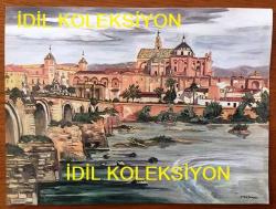 NADİR BİR KARTPOSTAL, FRANSIZ RESSAM YVES BRAYER'İN RESMETTİĞİ İSPANYA CORDOBA GUADALQUIVIR NEHRİ VE KÖPRÜSÜ ESERİ, ARKASI YAZILMAMIŞ, RENKLİ, 18 X 13 CM EBADINDA - 1940'LAR, 1950'LER, 1960'LAR, 1970'LER 1980'LER