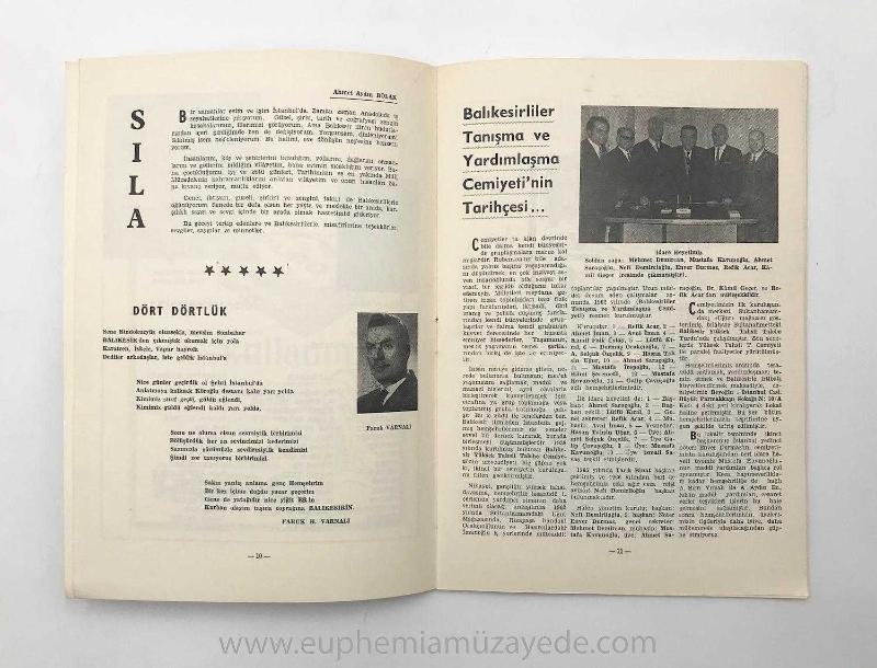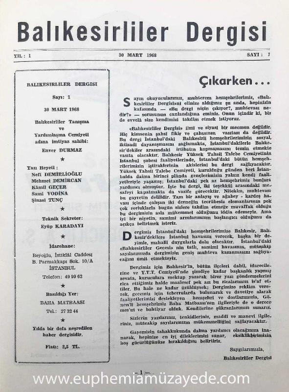 Özgün karton kapağında, temiz durumda, 28 x 19 cm, 32 sayfa, s/b fotoğraf, resim ve reklam sayfası. Senede bir sayı çıkan dergi İstanbul'daki Balıkesirli hemşerilerin sosyal, iktisadi dayanışmasını sağlamak, irtibatın kopmasını engellemek, Balıkesir Yüksek Tahsil Talebe Cemiyeti İstanbul şubesi ile Balıkesirlileri bir araya getirmek için çıkarılmıştır. Derginin çıkmasında Gönen'li Baha Matbaası da katkıda bulunmuştur. "Balıkesirliler Dergisi" [İLK DÖRT SAYI] 30 Mart 1968 - 3 Nisan 1971 Balıkesirliler Tanışma ve Yardımlaşma Cemiyeti Adına İmtiyaz Sahibi: Enver Durmaz, Baha Matbaası, İstanbul.