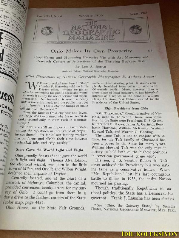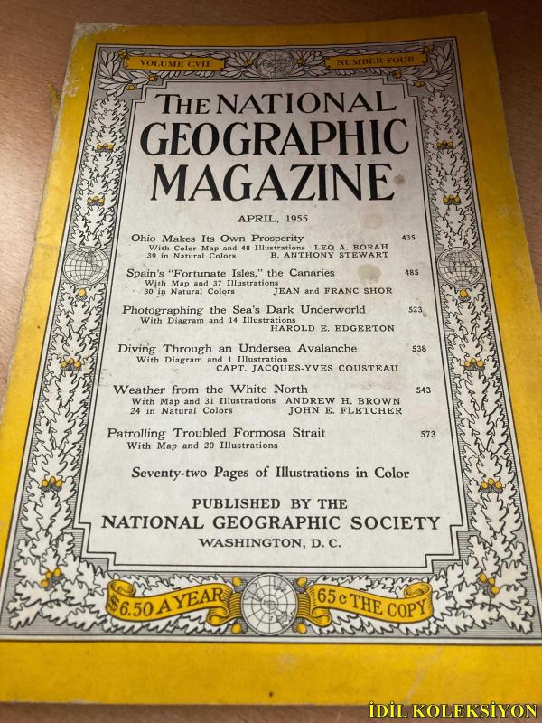 NATİONAL GEOGRAPHİC / VOLUME CVII / NO.4 / APRİL 1955 / İNGİLİZCE DERGİ (OHİO MAKES ITS OWN PROSPERİTY - B. ANTHONY STEWART / SPAİN'S FORTUNATE ISLES THE CANARİES - JEAN AND FRANC SHOR / PHOTOGRAPHİNG THE SEA'S DARK UNDERWORLD - HAROLD E. EDGERTON / DİVİNG THROUGH AN UNDERSEA AVALANCHE - CAPT. JACQUES YVES COUSTEAU / WEATHER FROM THE WHİTE NORTH - ANDREW H. BROWN & JOHN E. FLETCHER / PATROLLİNG TROUBLED FORMOSA STRAİT) (HAFİF YIPRANMALARI MEVCUT)