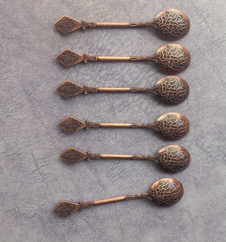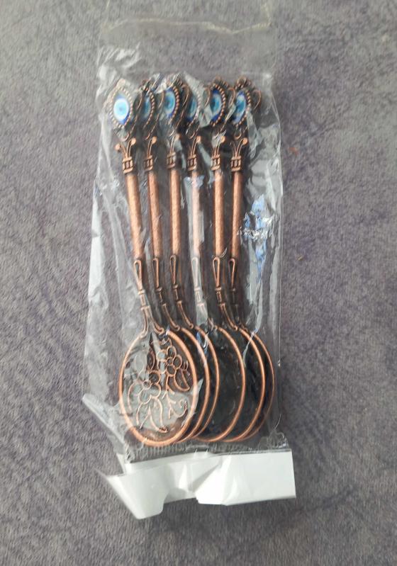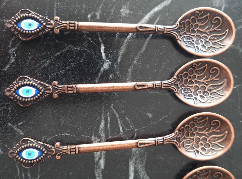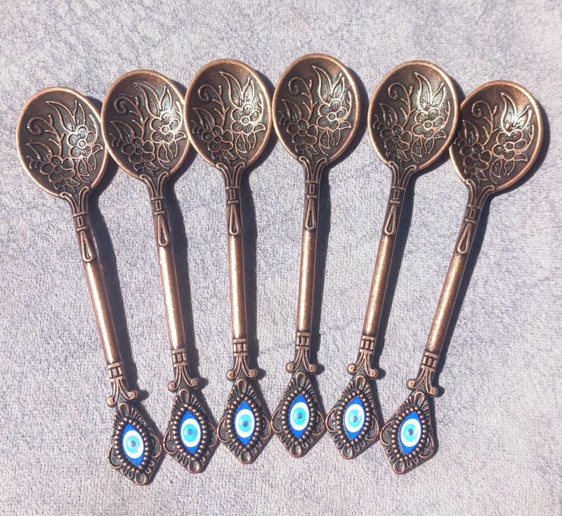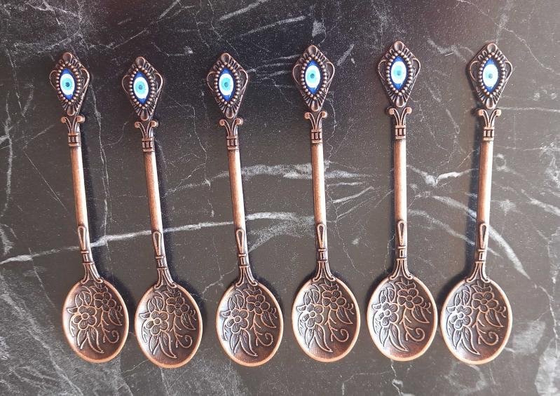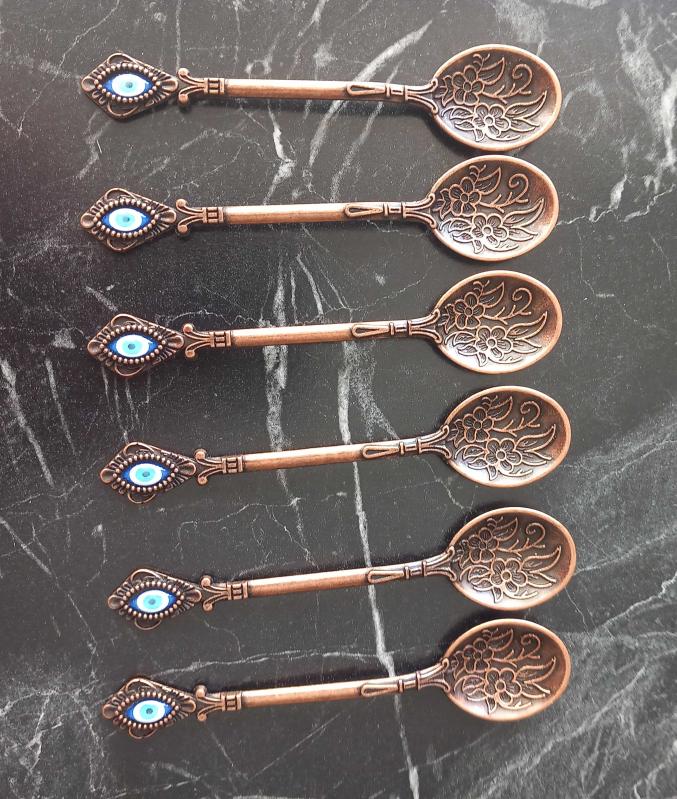 NAZAR BONCUKLU KABARTMA DESENLİ BAKIR RENKLİ 6'LI ÇAY KAŞIĞI. YENİ