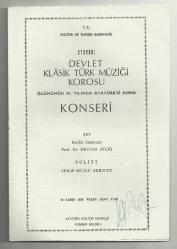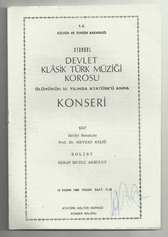 ** NEVZAD ATLIĞ DEVLET KLASİK TÜRK MÜZİĞİ KOROSU KONSERİ / SOLİST SERAP MUTLU AKBULUT ** 25 x 17 cm.ebadında,4 yaprak 8 sayfalık,çok iyi kondüsyonda konser programıdır...