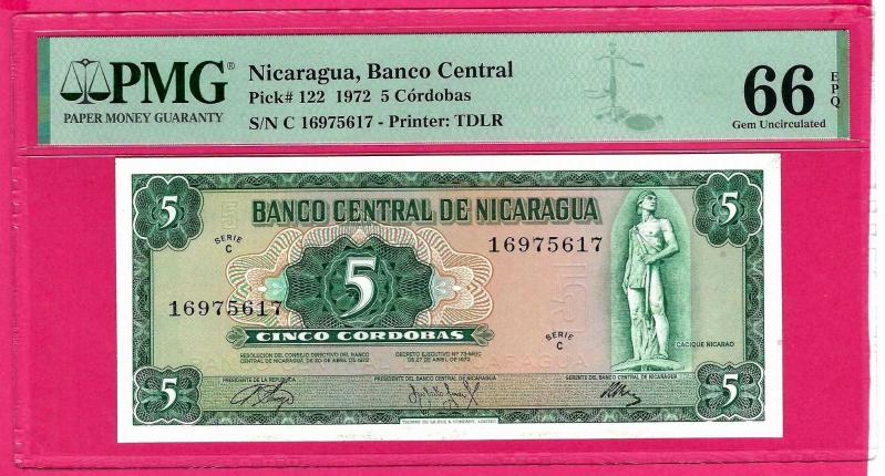 NICARAGUA 5 Cordobas 1972 p122 UNC PMG 66 EPQ (TK 18 823) ÇİL, bir ay önce satışa sunulmuştur.