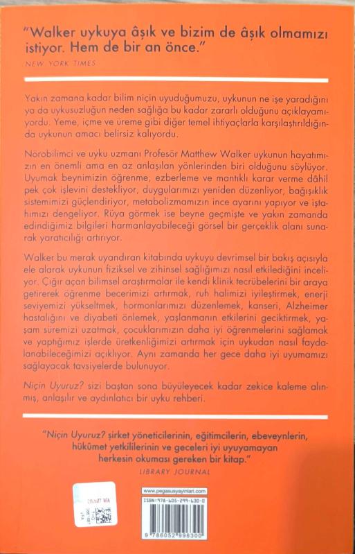 NİÇİN UYURUZ ? - YENİ UYKU VE RÜYA BİLİMİ, Matthew Walker tarafından kaleme alınmıştır. Kitap 2025 yılında Pegasus tarafından [İstanbul] yayınlanmıştır. Bu baskının çevirisi Sevinç Seyla Tezcan tarafından yapılmıştır. 400 sayfadır. NİÇİN UYURUZ ? - YENİ UYKU VE RÜYA BİLİMİ adlı eser Türkçe dilindedir.
