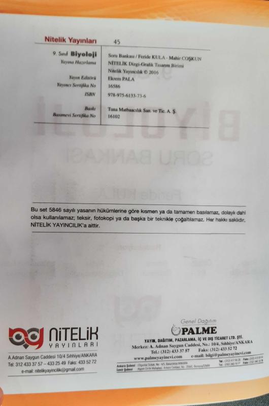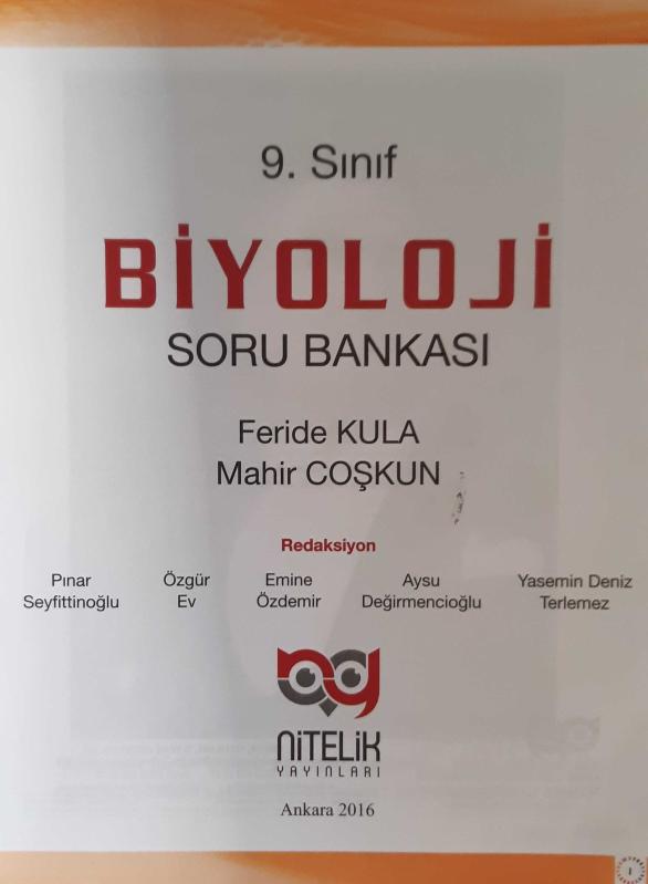 LÜTFEN AÇIKLAMAYI OKUYUN... NİTELİK YAYINLARI 9. SINIF BİYOLOJİ SORU BANKASI 2016 BASKISI 244 SAYFA LÜTFEN DİKKAT 20 SAYFA KURŞUN KALEMLE ÇÖZÜLMÜŞTÜR. GERİ KALAN SAYFALAR SAĞLAMDIR. EKSİK, YIRTIK, KOPUK SAYFASI YOKTUR.. 2. EL KİTAP