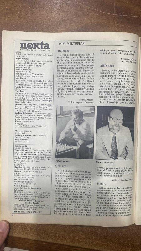 NOKTA HABER DERGİSİ - 20 MART 1988 SAYI: 11 GÜNER KUBAN - MUHSİN YAZICIOĞLU - JOAN BAEZ - KADİR ÇITAK - IŞIN ÇELEBİ - BİLSAY KURUÇ - BASKIN ORAN - PAUL BREITNER - ERCAN ARIKLI - ADİL ÖZKOL - DUYGU ASENA - KORHAN ATAY - AYCAN GİRİTLİOĞLU - GÜLAY GÖKTÜRK - SALİH MEMECAN - MUSTAFA ÖZYÜREK - EMİN TANRIYAR - HINCAL ULUÇ - ARDA USKAN - HİLMİ YAVUZ - ENGIN VARDAR - AYDIN DEMİRER - VIKI İZRAİL - NİLGÜN UYSAL - LEVENT TAYLA - HAKAN AKÇAOĞLU - FIGEN AKŞİT - ALİ BORATAV - YÜCEL GÖKTÜRK - SEFA KAPLAN - ŞAZİYE KARLIKLI - MAHMUT ÖVÜR - SERHAT ÖZTÜRK - MEHMET YALÇIN - AYŞEGÜL DEVECİOĞLU - GÜL BÜYÜKBEŞE - RUŞEN ÇAKIR - HIDIR GÖKTAŞ - CAN KARAKAŞ - CENGİZ KUŞÇUOĞLU - HALUK MÜFTÜOĞULLARI - NURAY ŞİRİN - AYTEKİN YILDIZ - AHMET KÖKÇÜ - YAĞMUR ATSIZ - ABDULLAH GÖRGÜN - MİHAIL VASILIADIS - ADEM ALFAN - ERZADE ERTEM - BATUHAN KIRAN - ÜMİT KİRDİL - CEVAT ÇAPAN - KAAN ARSLANOĞLU EL ELE ANAYASA DEĞİŞİKLİĞİ - DYP-SHP - KADIN KADINA - ERLERE TECAVÜZ EDEN TEĞMEN - SÜT ŞİŞELERİ MİKROPLU - İZMİR’DE TAKSİ -64 SAYFA