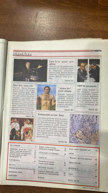 NOKTA HABER DERGİSİ - 5 OCAK 1986 SAYI: 52 GENEL GREV DİYOR SENDİKALAR - KAFAMIZDAKİ ŞEYTAN - TÜRK İŞ'TE GENEL GREV EĞİLİMİ - ŞEVKET YILMAZ - ÖNCE MAL SONRA CAN - MARCOS - AQUINO - ALTINCI HİS NEŞTER ALTINDA - ZEKAYI ÖLÇMEK MÜMKÜN MÜ - SHP'DE KAYNAŞMA - ETİMİNE - HEDİYELERİN YAĞDIĞI BELEDİYE - ORGAN VAKFI'NDA SORUŞTURMA - ACİL SERVİSLERİN ACİL İHTİYAÇLARI - İÇİ İÇİNE SIĞMAYAN SHP - ALİ URAS - DORUKTAKİLER 85 - PARAPSİKOLOJİ GİZEMİ - SANCILI CİNSEL İLİŞKİLER - FİLİPİNLER'DE MALINI KAÇIRAN KAÇIRANA - DİNDARLARIN ŞIKLIĞI - EDEBİYAT ÖDÜLLERİNDE GÖLGE - İSTANBUL BİR CAMBAZHANEDİR - NOKTA'DAN - NE NEREDE - GÜNLERİN GETİRDİĞİ - 72 SAYFA, ERCAN ARIKLI tarafından kaleme alınmıştır. Kitap GELİŞİM YAYINLARI tarafından yayınlanmıştır. 72 sayfadır. NOKTA HABER DERGİSİ - 5 OCAK 1986 SAYI: 52 GENEL GREV DİYOR SENDİKALAR - KAFAMIZDAKİ ŞEYTAN - TÜRK İŞ'TE GENEL GREV EĞİLİMİ - ŞEVKET YILMAZ - ÖNCE MAL SONRA CAN - MARCOS - AQUINO - ALTINCI HİS NEŞTER ALTINDA - ZEKAYI ÖLÇMEK MÜMKÜN MÜ - SHP'DE KAYNAŞMA - ETİMİNE - HEDİYELERİN YAĞDIĞI BELEDİYE - ORGAN VAKFI'NDA SORUŞTURMA - ACİL SERVİSLERİN ACİL İHTİYAÇLARI - İÇİ İÇİNE SIĞMAYAN SHP - ALİ URAS - DORUKTAKİLER 85 - PARAPSİKOLOJİ GİZEMİ - SANCILI CİNSEL İLİŞKİLER - FİLİPİNLER'DE MALINI KAÇIRAN KAÇIRANA - DİNDARLARIN ŞIKLIĞI - EDEBİYAT ÖDÜLLERİNDE GÖLGE - İSTANBUL BİR CAMBAZHANEDİR - NOKTA'DAN - NE NEREDE - GÜNLERİN GETİRDİĞİ - 72 SAYFA adlı eser Türkçe dilindedir.
